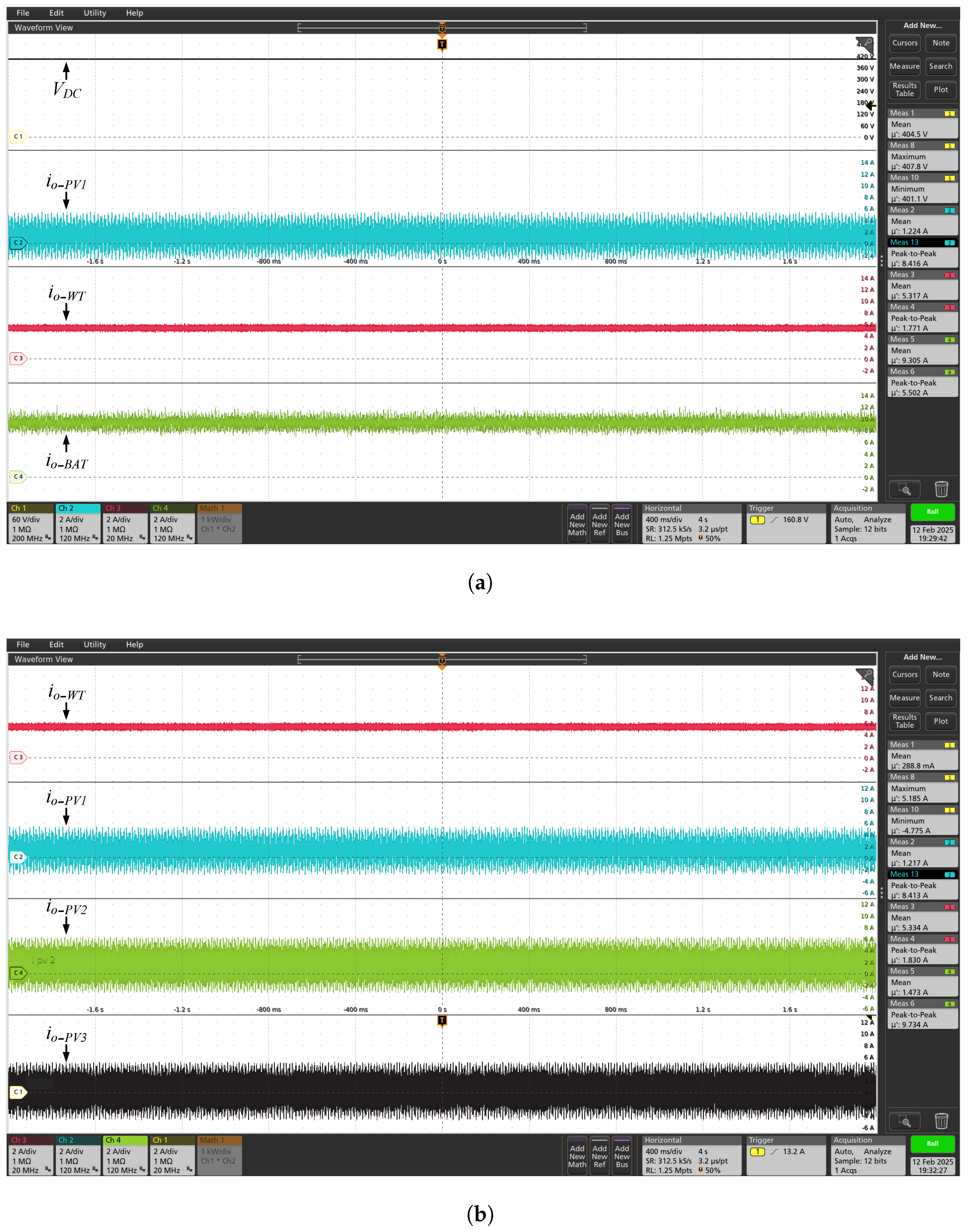 This paper’s contributions are underscored by its successful implementation and validation of a DC microgrid that not only efficiently processes and manages renewable energy but also effectively stores excess energy and supplies stable DC power to the electrolyzer for production. This includes providing power to essential AC-powered auxiliary systems like pumps and heaters, thereby showcasing tangible improvements in operational efficiency and overall system performance. The detailed descriptions of the power interfaces for the electrolyzer (Phase-Shifted Full-Bridge Zero-Voltage-Switching (PSFB-ZVS) converter), BESS (interleaved bidirectional buck converter), PV (two-switch non-inverter buck–boost converter), and wind (two-stage topology with a rectifier and buck–boost interleaved converter) further highlight the practical engineering solutions developed to achieve a modular, efficient, and low-ripple system conducive to enhanced green hydrogen production efficiency.