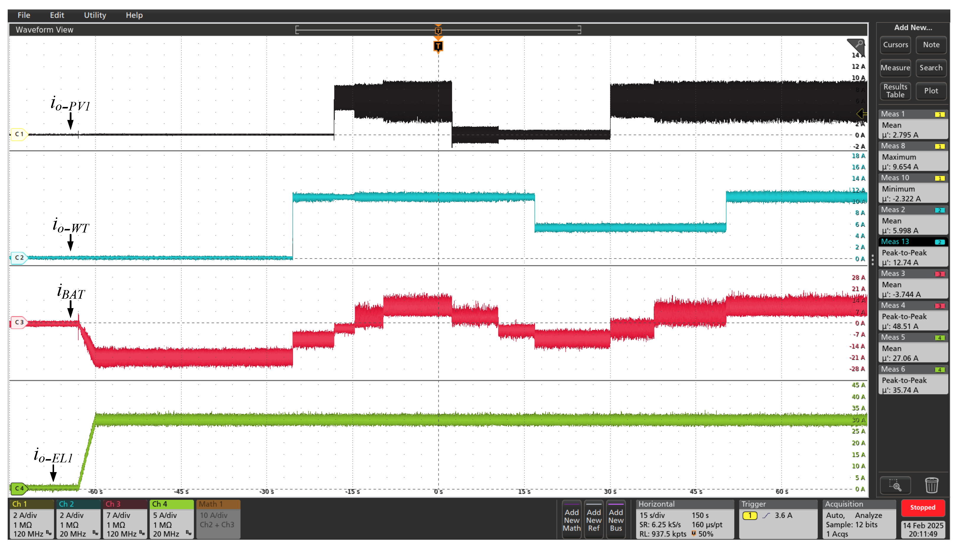 To assess the system’s dynamic performance under renewable energy fluctuations, a test was carried out emulating the intermittent behavior of solar and wind sources, as shown in