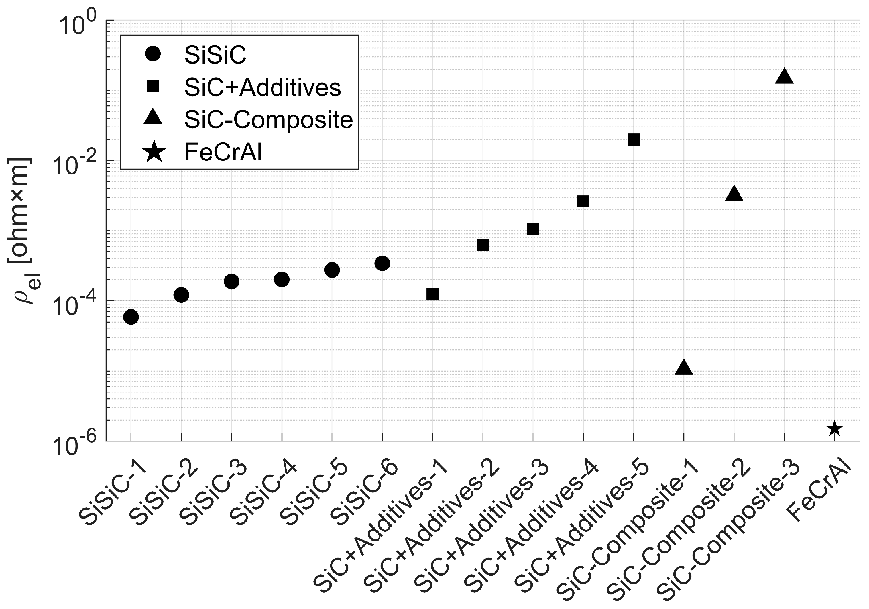 Figure 4, the 3D-printable SiSiC variants exhibit specific electrical resistivity values of approximately
