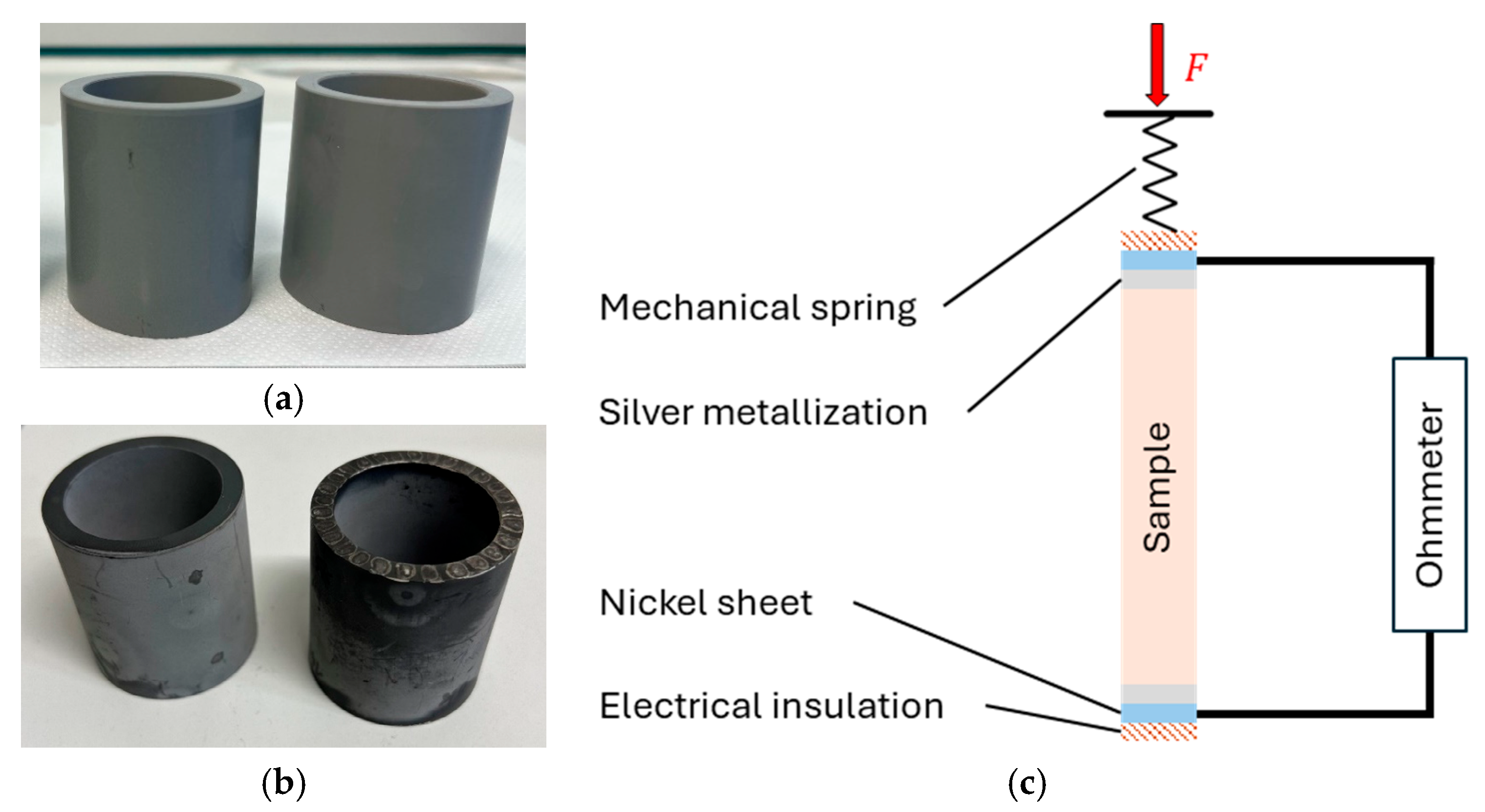 This setup enables a direct comparison of metallized and non-metallized components regarding contact resistance. For this purpose, the tube is clamped at both ends between nickel sheets and electrical insulators, with a defined contact force applied via a mechanical spring. Contact resistance as a function of contact pressure is measured using a DC milliohmmeter (GW Instek, Taipei, Taiwan), which precisely records the total resistance of the setup, including the contact resistance, the intrinsic tube resistance provided by the manufacturer, and the known resistance of the supply lines. To assess the effect of metallization, measurements were performed on samples with and without silver coating under varying contact pressures at room temperature.