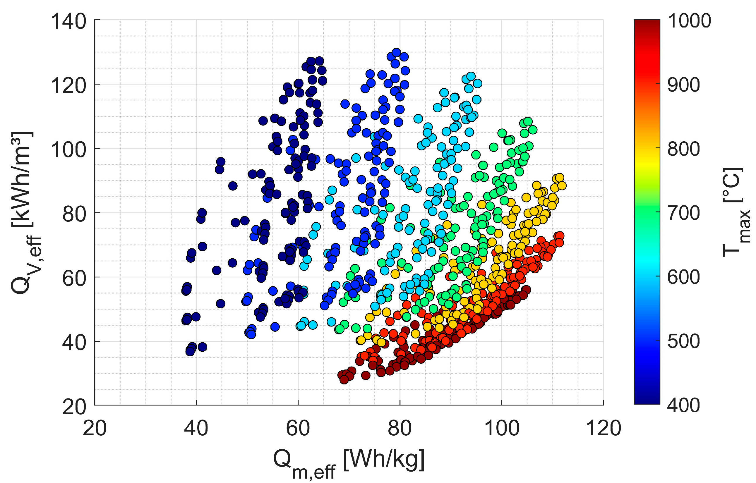The results reveal a wide range of possible energy densities, arising from variations in storage dimensions (), void fraction (), specific surface (), and maximum storage temperature (). Maximum gravimetric and volumetric energy densities occur at specific storage temperatures due to opposing effects: higher temperatures increase the energy density of the solid storage medium and reduce the required storage mass and volume, but simultaneously demand thicker thermal insulation to maintain the maximum permitted outer surface temperature of 60 °C. A maximum gravimetric energy density of about 110 Wh/kg is reached at 800 °C, while the maximum volumetric energy density (about 130 kWh/m3) occurs at 500 °C.