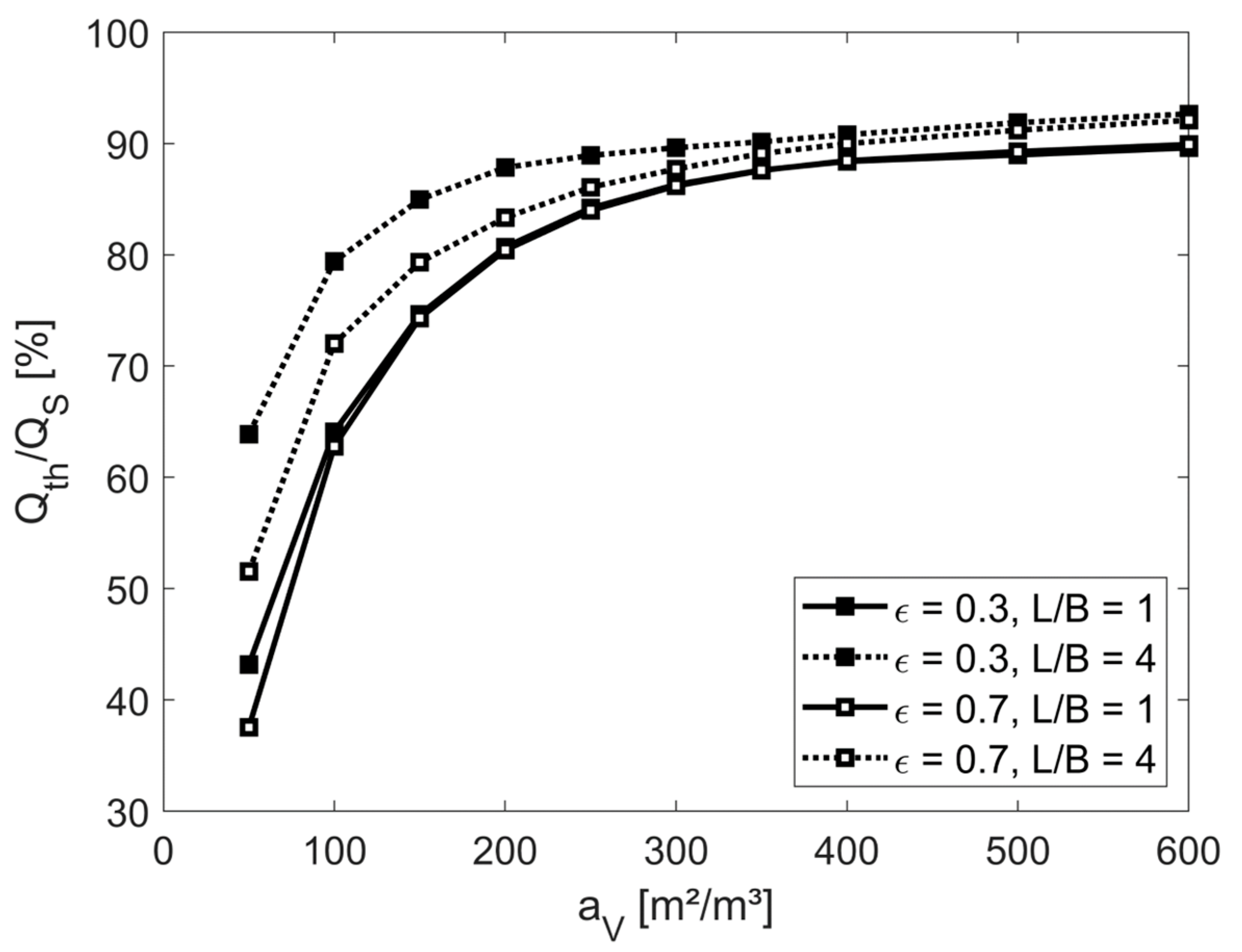 It can be seen that higher specific surfaces significantly enhance storage utilization. Further moderate improvements are also achieved by increasing the length-to-width ratio ( = L/B) and by decreasing the void fraction, as this leads to higher total heat transfer coefficients due to increased flow velocities. In summary, a specific surface of at least 200 m2/m3 and small void fractions are required to reach storage utilization of up to 90%, and thus high effective storage densities.