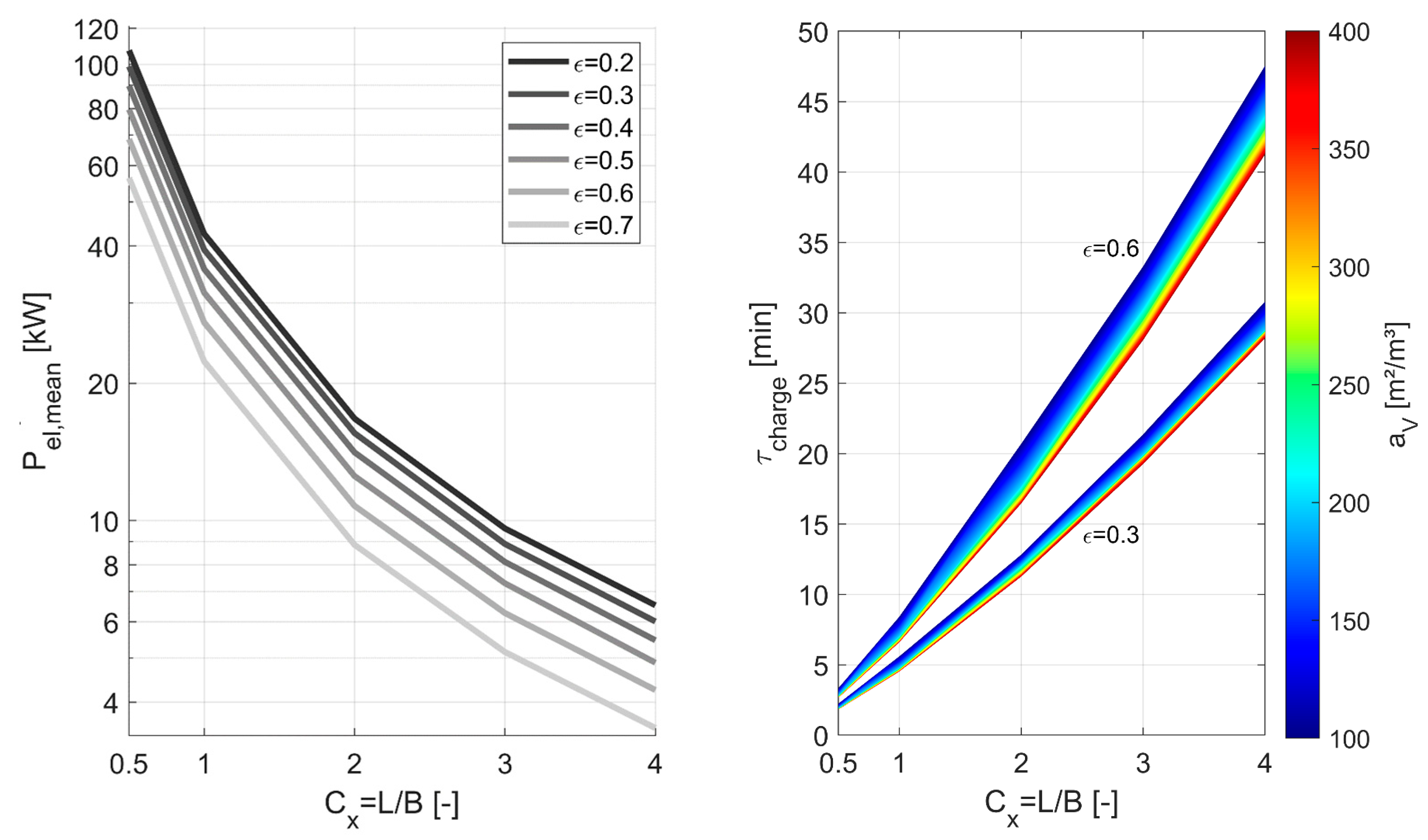 Figure 10 (left) shows the variation in average electrical power as a function of the storage dimensions