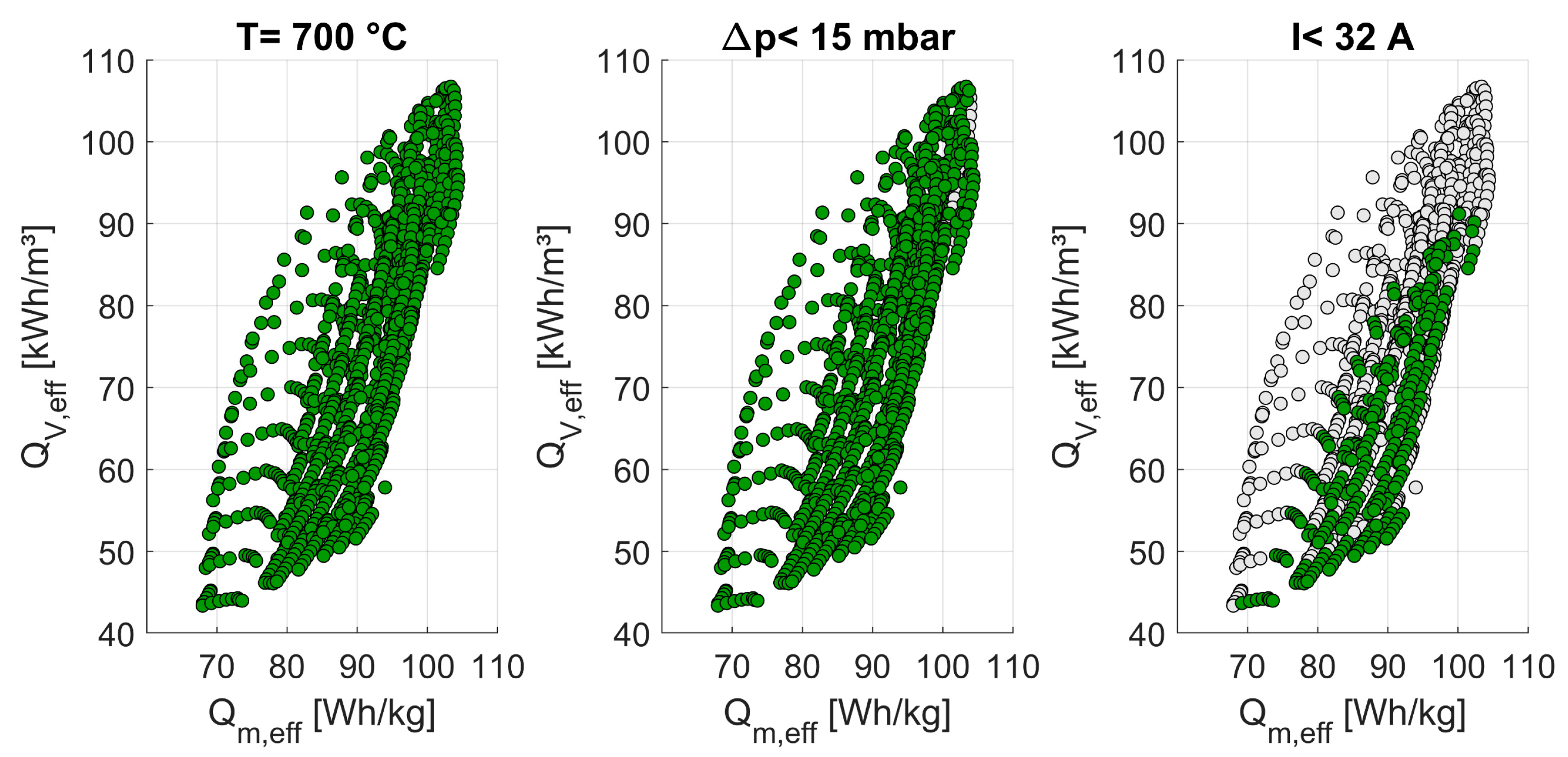 Figure 11, left), applying the target criteria—a maximum pressure drop of 15 mbar and maximum current levels up to 32 A (~7.4 kW, see
