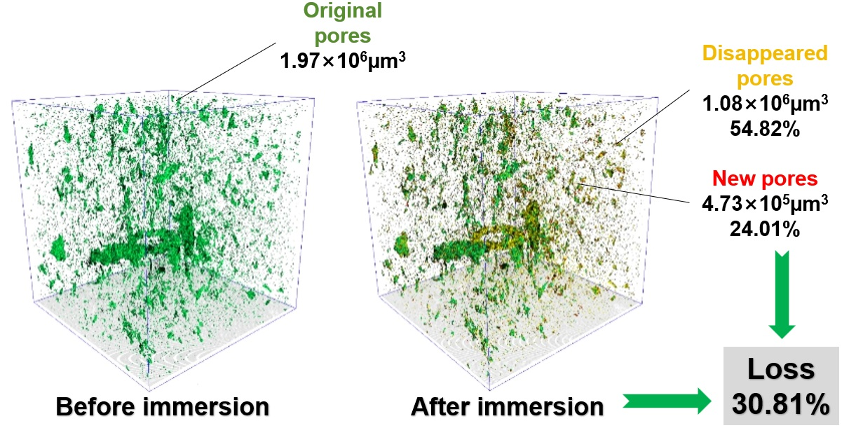 - Micro-CT imaging and pore size distribution analyses corroborate that shale oil cores undergo substantial pore expansion and structural reorganization during hydration, driven by the formation of larger pore networks. In contrast, shale gas cores, constrained by denser matrices and hydration-induced particle migration and pore blockage, exhibit a more intricate pore evolution process, resulting in limited overall changes to pore structure.