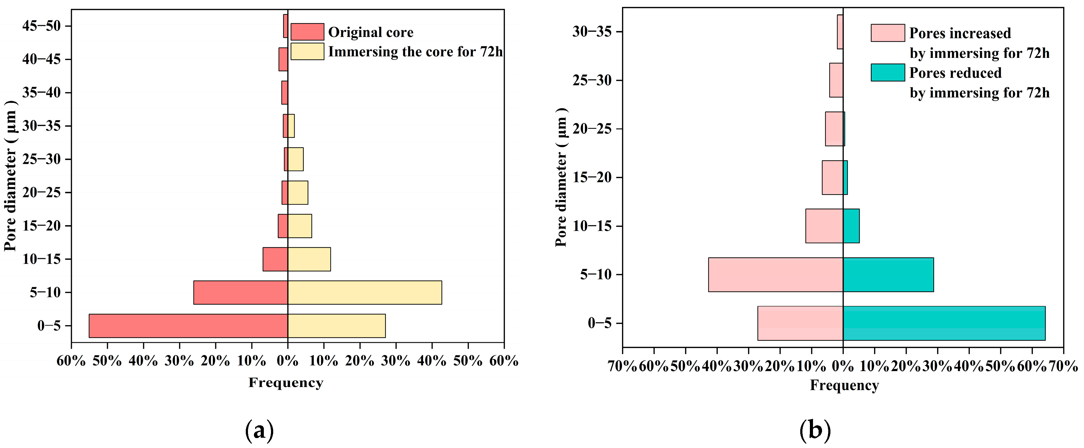 - Hydration by fracturing fluids induces a dynamic evolution in reservoir pore structures, termed “damage–reconstruction.” After 72 h of hydration, both core types experience a net reduction in pore volume. However, shale oil cores demonstrate a superior capacity for pore reconstruction, wherein original micropores interconnect and coalesce to form larger pore networks, highlighting their enhanced potential for structural modification compared to gas cores.