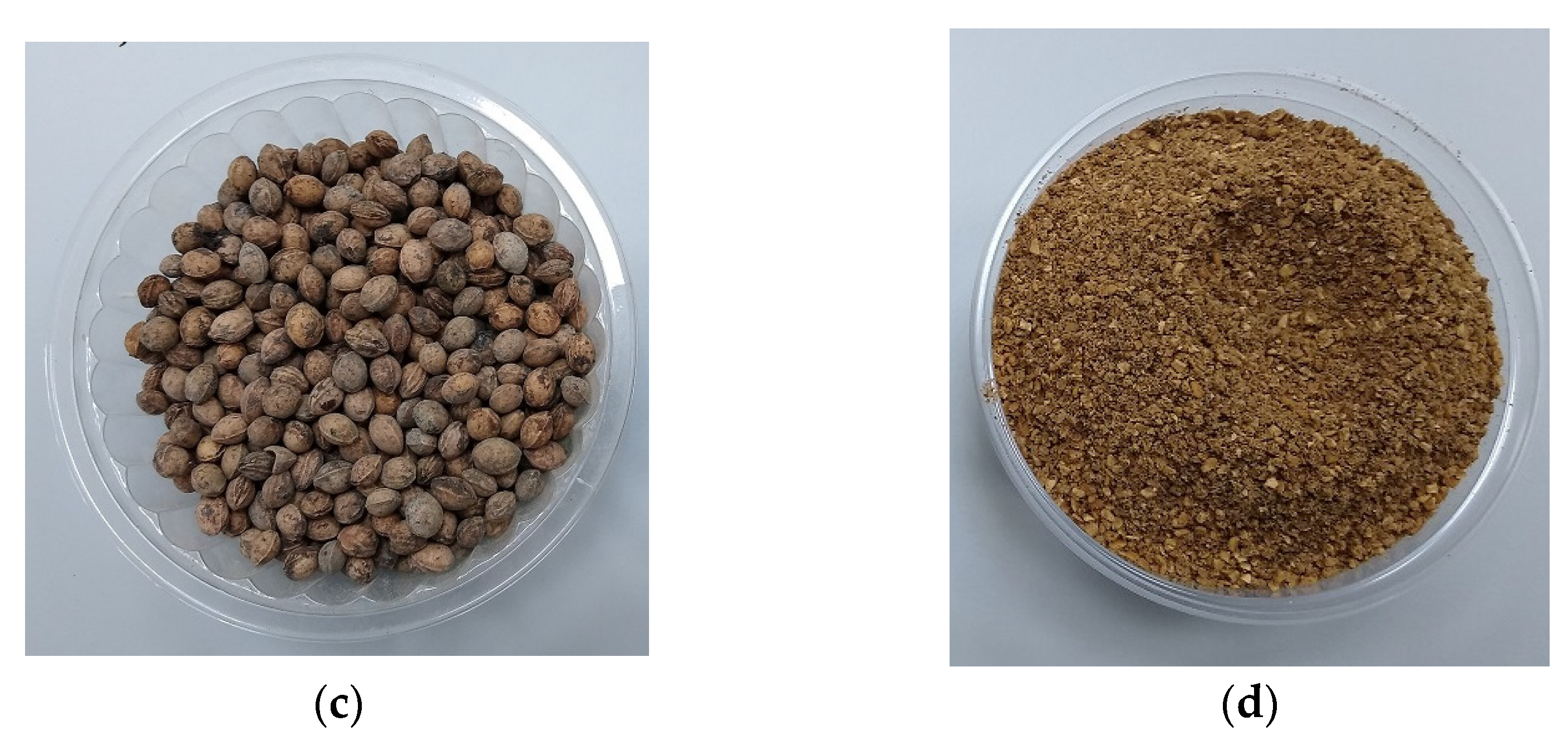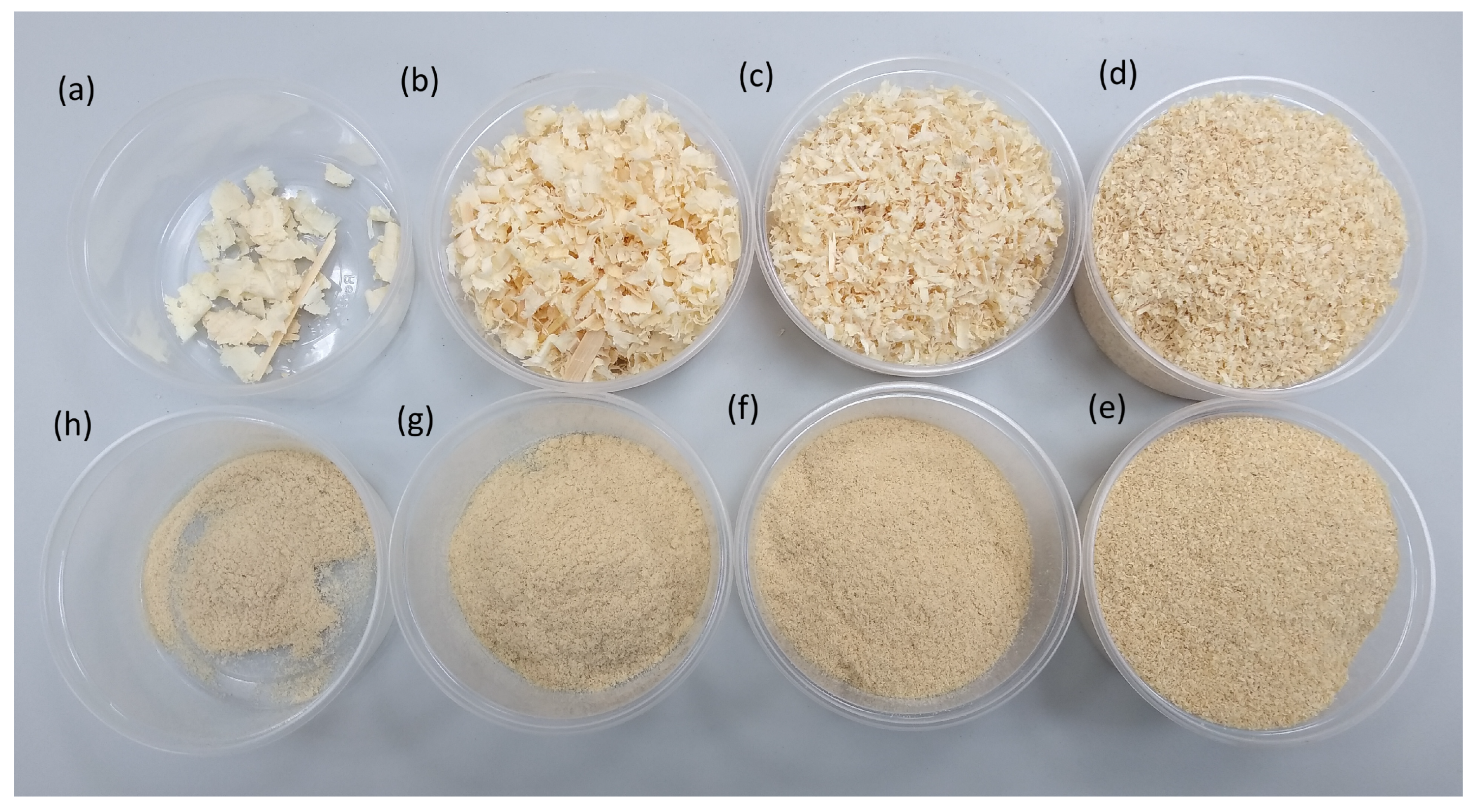 The primary raw material used in this study consisted of former production residues (sawdust, shavings, and cuttings) obtained from the “DAK-POL” plant company and crushed cherry stones supplied by C.K. Frost Sp. z o.o. (Śmiłowice, Poland) (