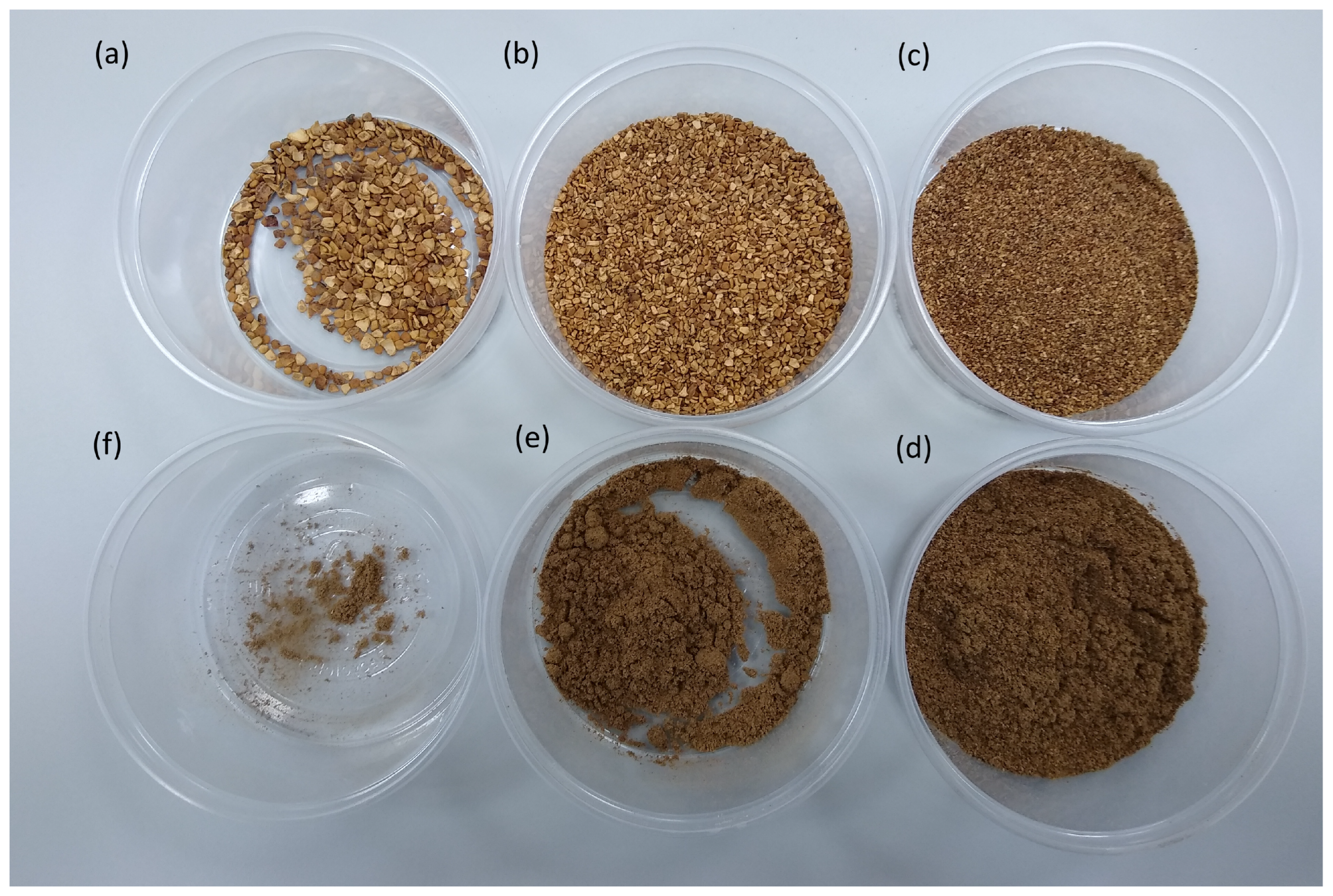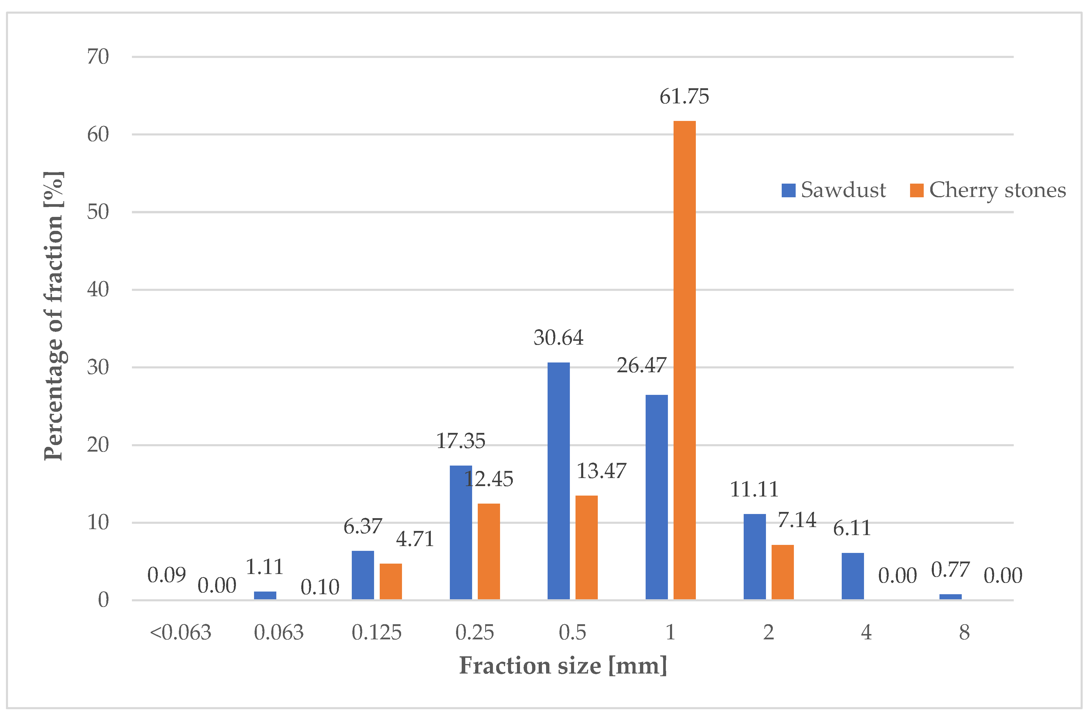 The granulometric distribution of the raw materials (sawdust and crushed cherry stones) was analyzed using a Multiserv Morek LPz-2e programmable sieve shaker equipped with a set of sieves (Multiserv Morek, Marcyporęba, Poland), in accordance with the PN-R-64798:2009 standard [
