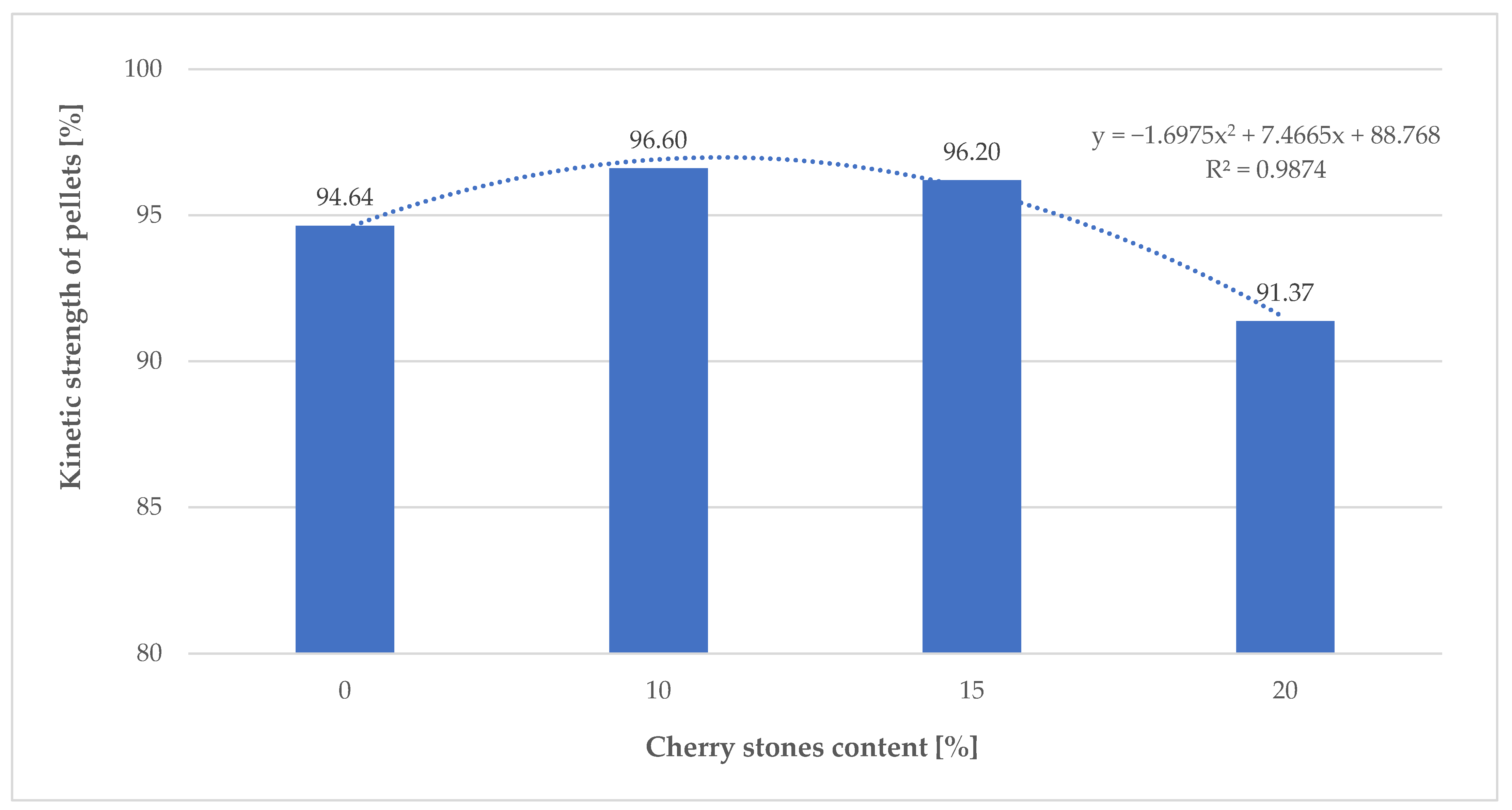 Figure 6 presents the results of tests on the effect of crushed cherry stones in the mixture with sawdust on the kinetic strength of the obtained pellets.