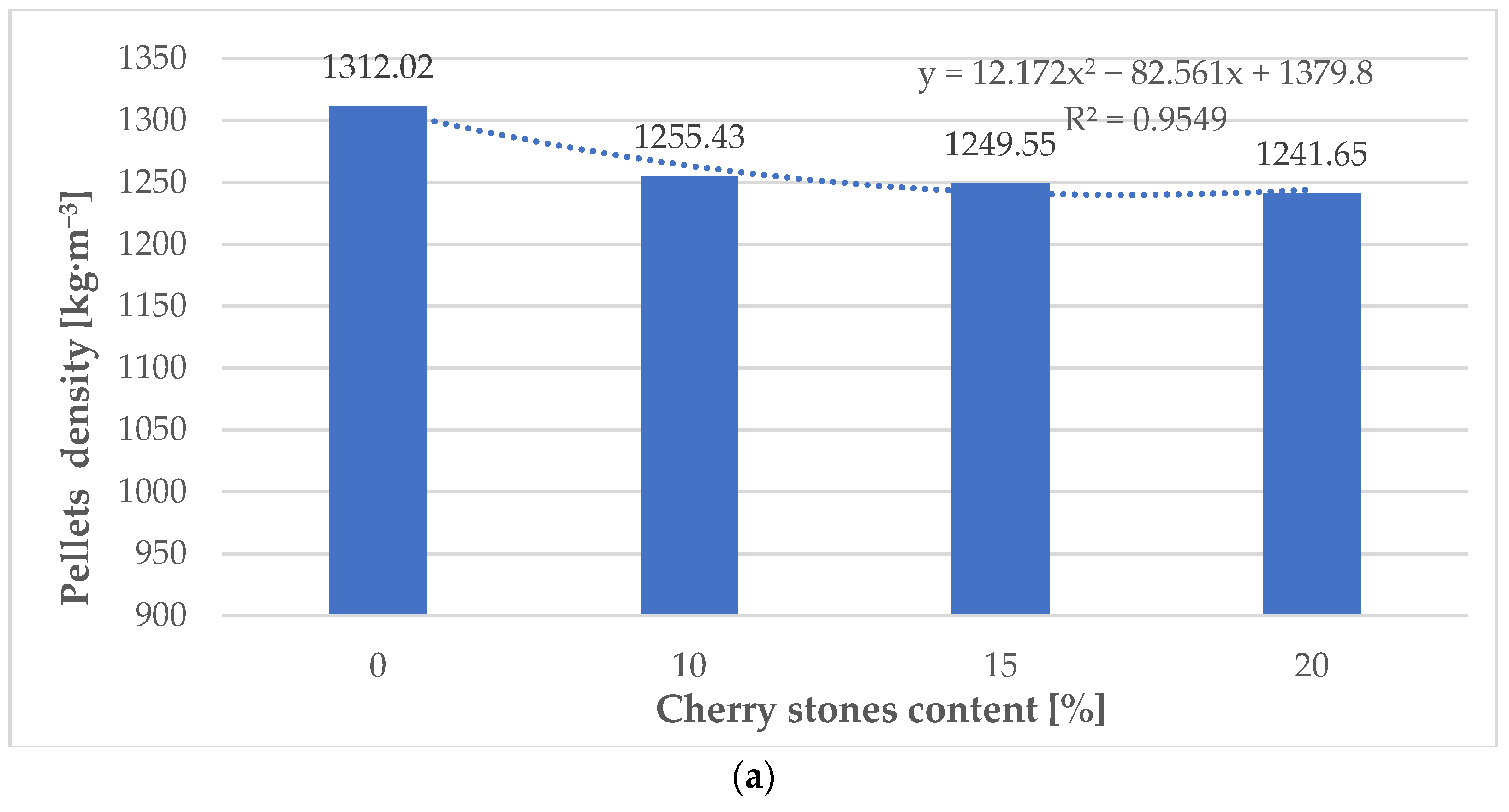 Figure 7a, increasing the proportion of crushed cherry stones from 10% to 20% slightly reduced pellet density, from 1255.43 kg·m