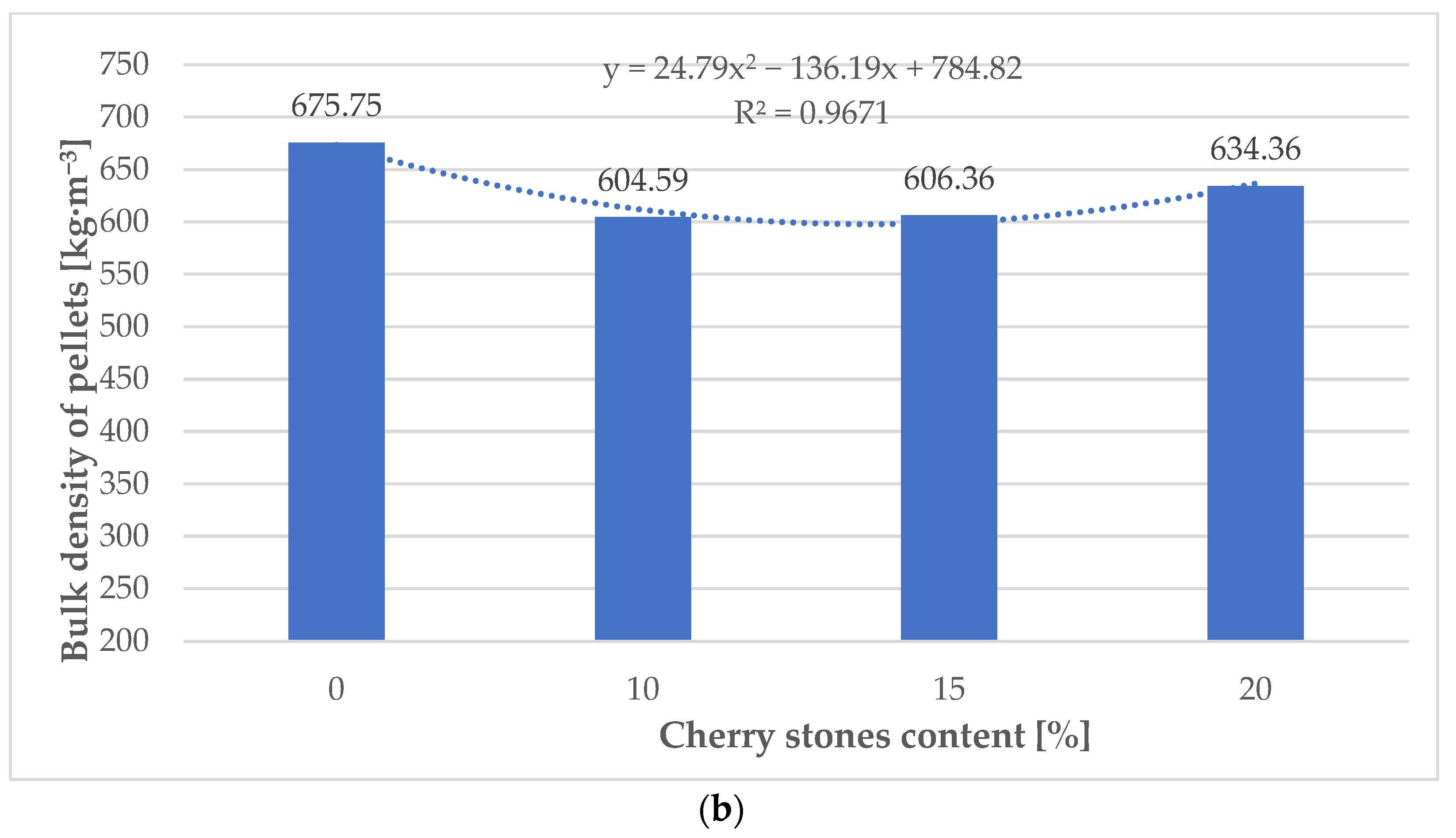 Figure 7b). An increase in the share of crushed cherry stones from 10% to 20% results in a rise in bulk density, from 604.59 kg·m