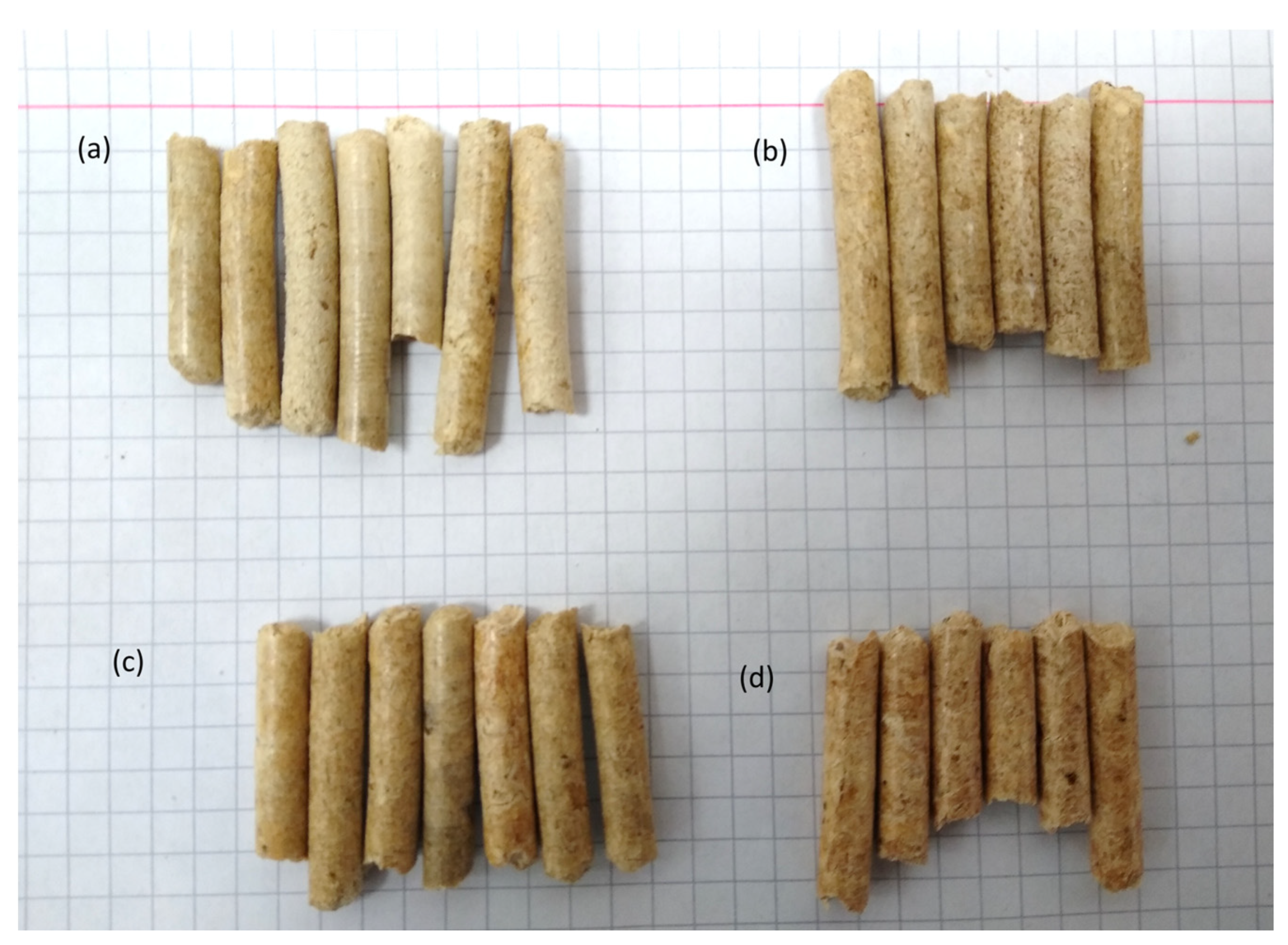14] assessed the effect of adding potato pulp to pine sawdust on the pelletization process and the properties of the obtained fuel pellets, taking into account both laboratory and industrial tests. It was found that potato pulp acts as a natural binder, improving the pelletization process (lower energy, higher strength). Chojnacki et al. [