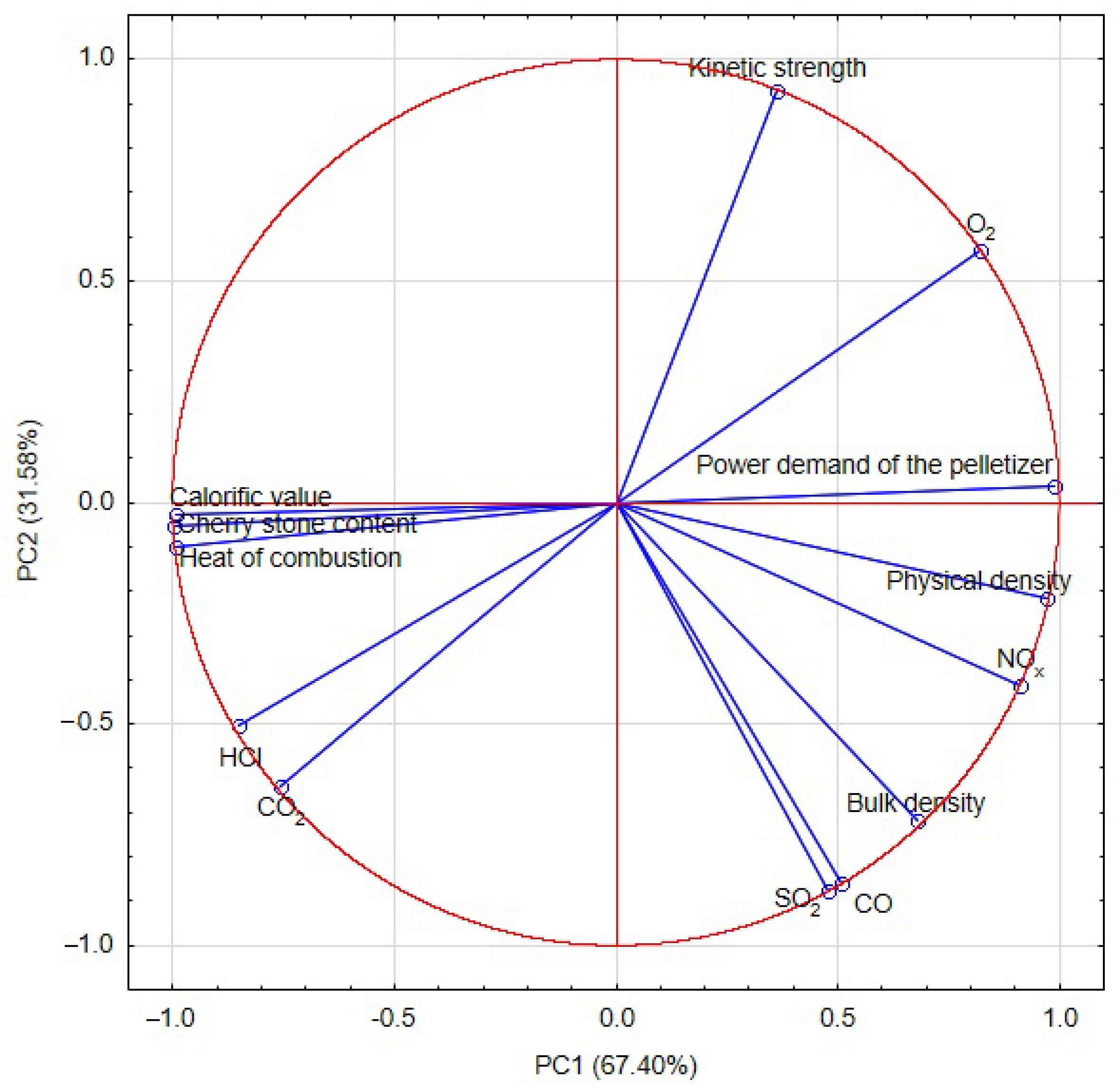 Principal component analysis (PCA) confirmed these results, indicating that the proportion of crushed cherry stones, heat of combustion, and calorific value were characterised by the highest negative loadings, ranging from −0.9921 (heat of combustion) to −0.9951 (cherry stone content), with respect to the first principal component (