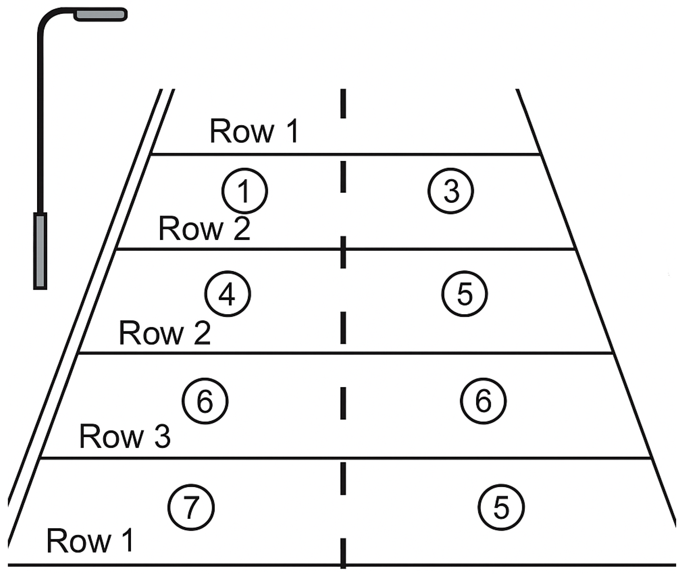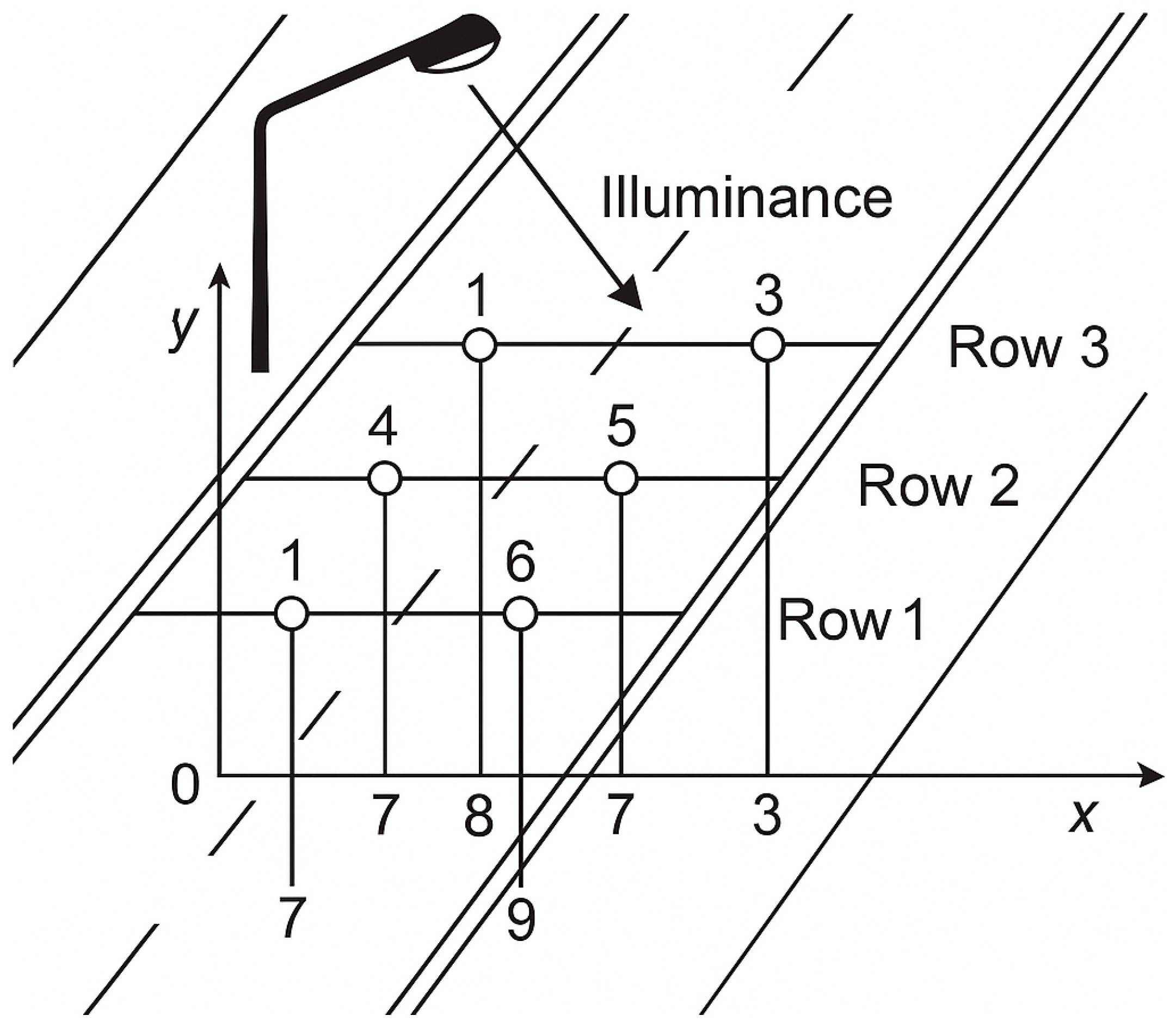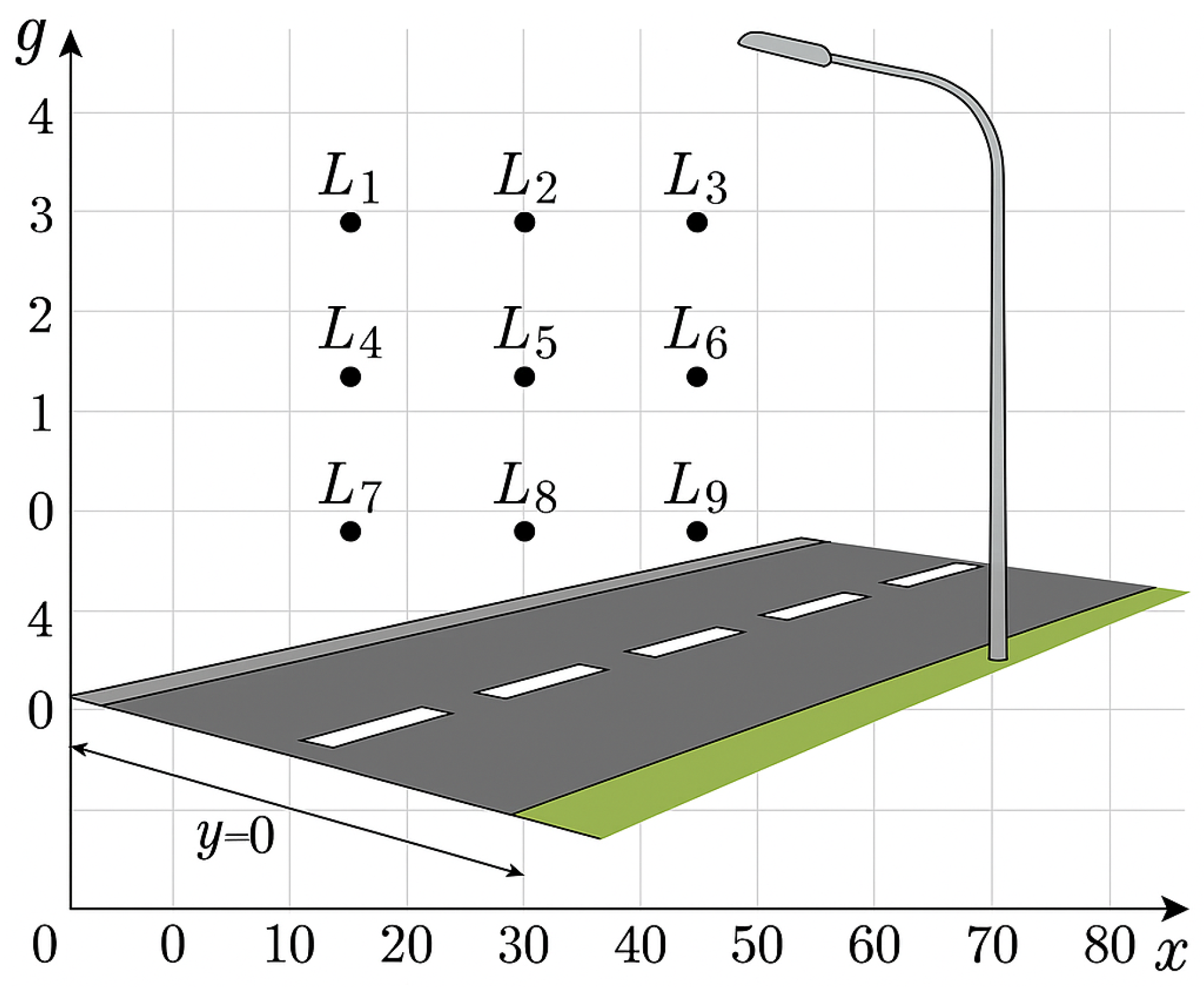 Luminance measurement points on a road according to normative requirements in Poland. Source: author’s own study.