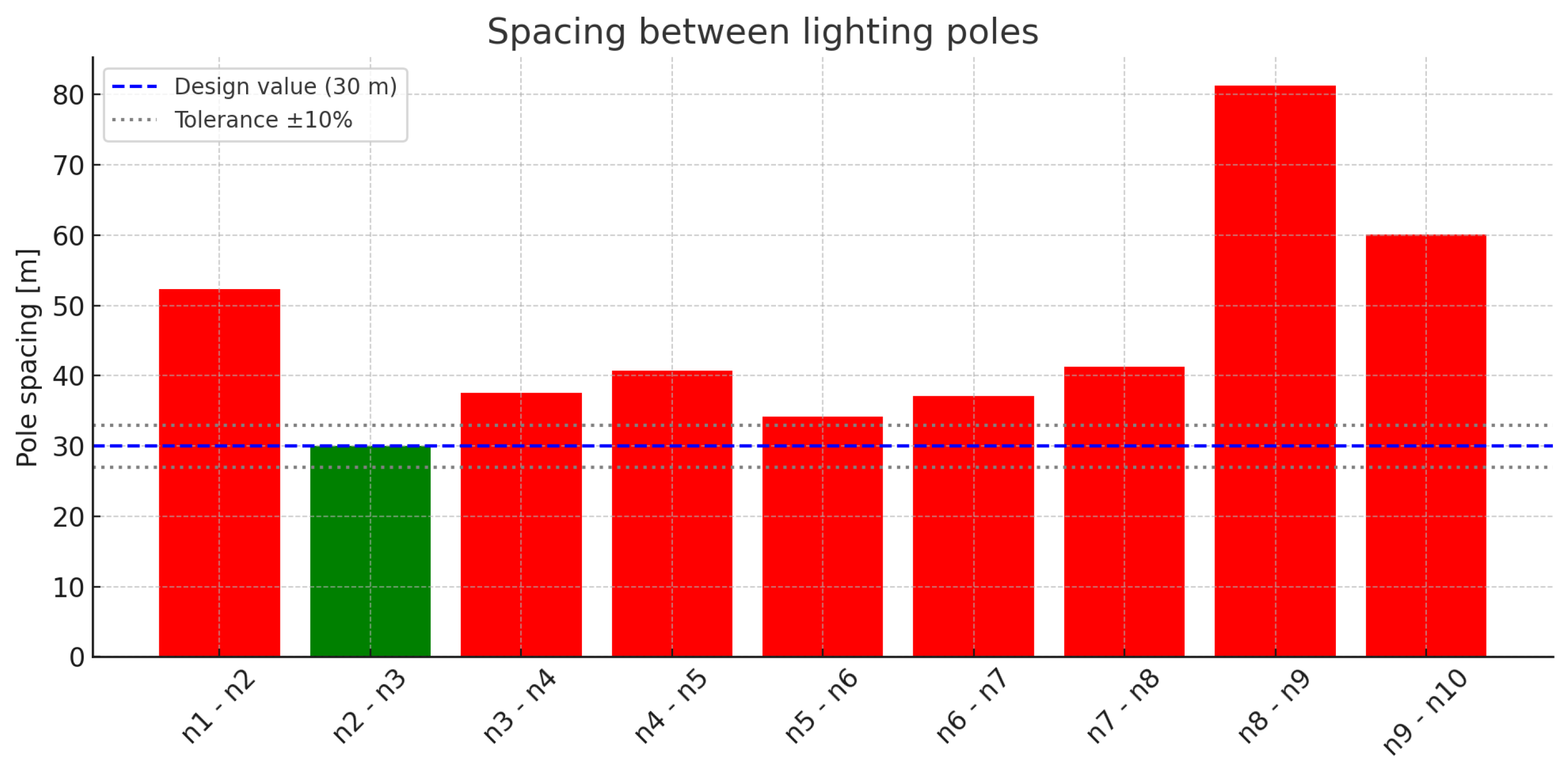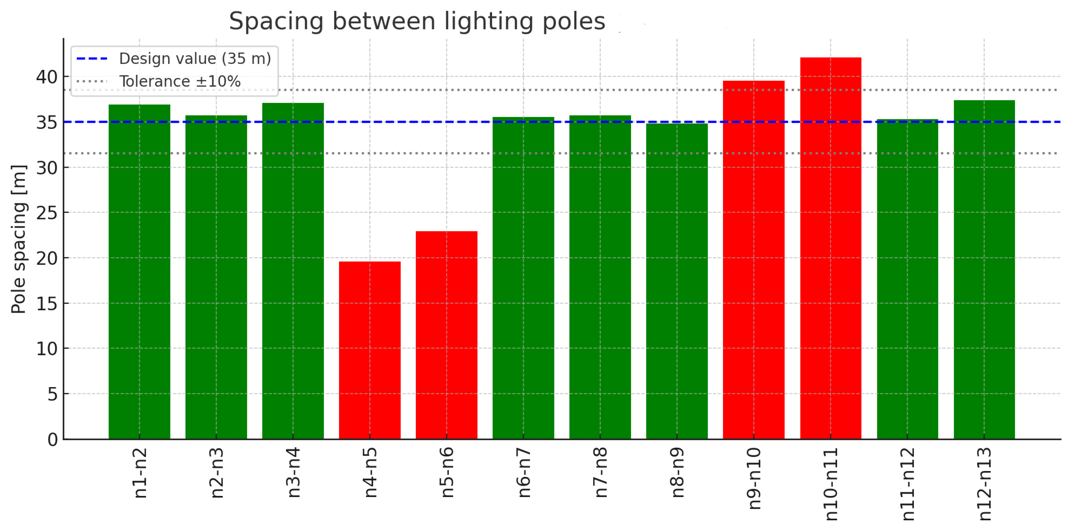 Spacing between lighting poles in variant M(1:1). Source: author’s own study.