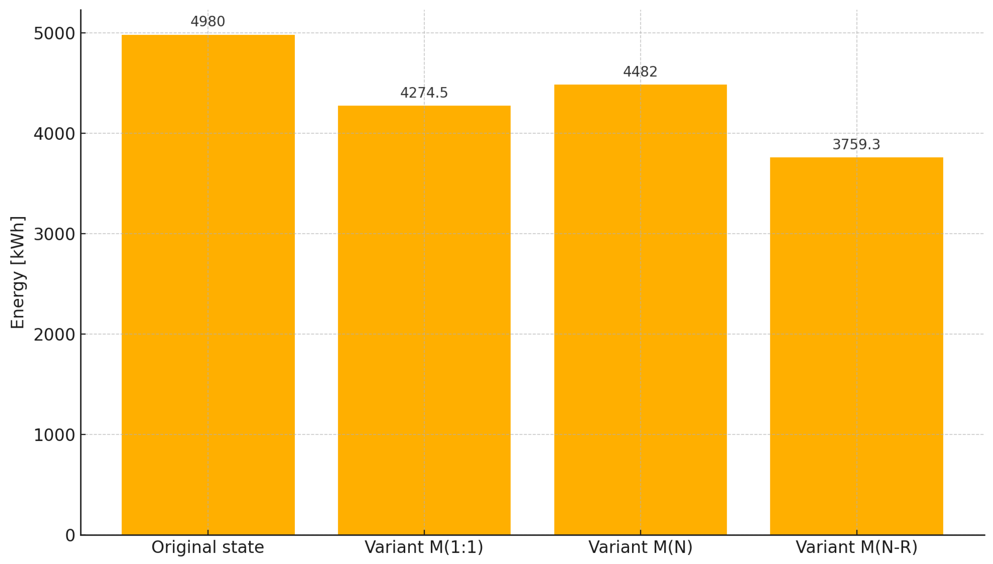 Estimated electricity consumption for the lighting installations: original state, variant M(1:1), variant M(N), and variant M(N-R) with power reduction. Source: author’s own study.