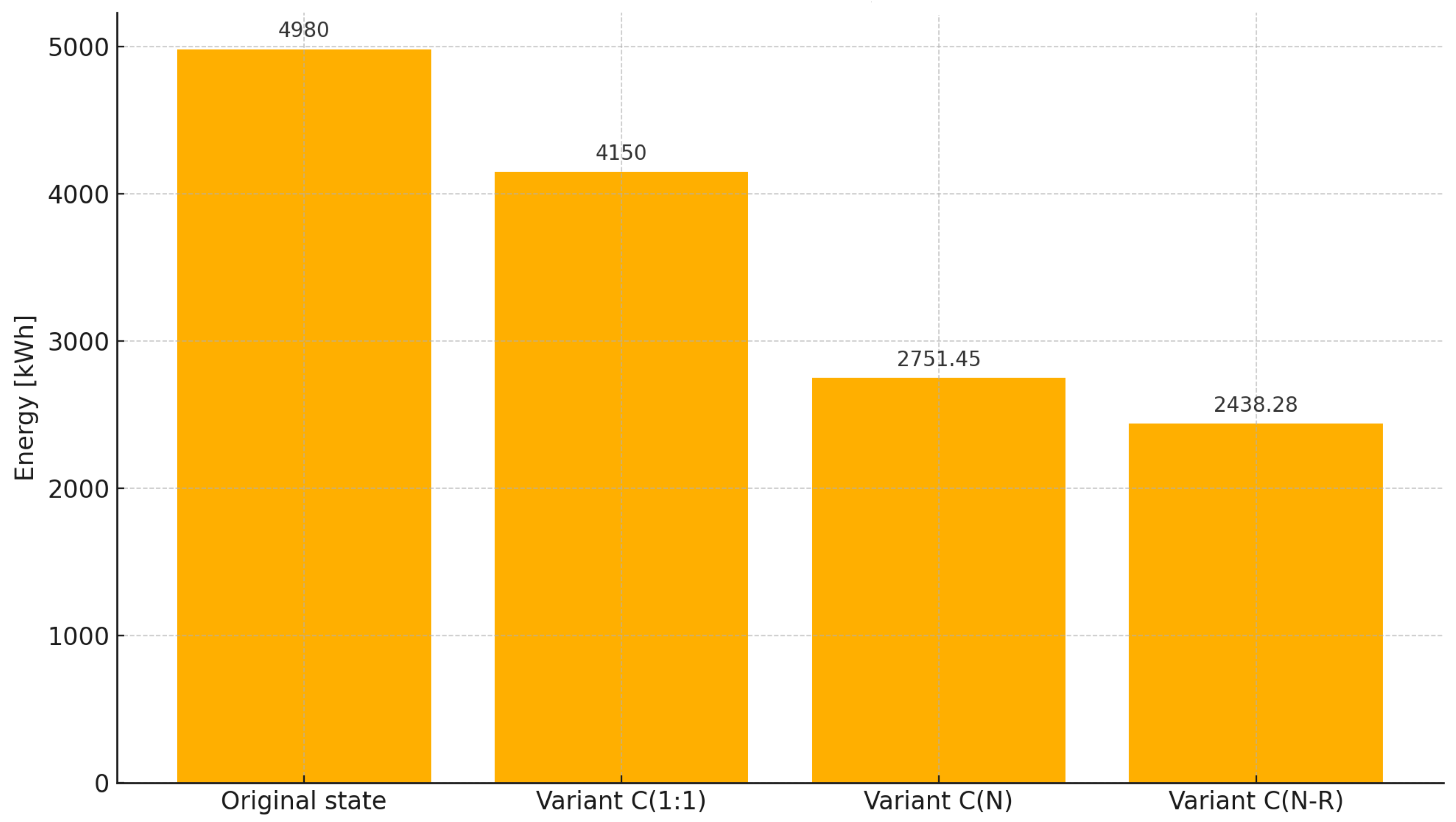 Estimated electricity consumption for the lighting installations: original state, variant C(1:1), variant C(N), and variant C(N-R) with power reduction. Source: author’s own study.