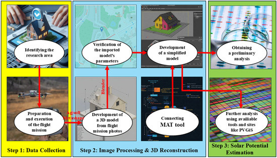 The proposed study employs a combination of UAV-based photogrammetry and 3D modeling techniques to assess rooftop suitability for PV installations. The methodological framework consists of the following steps: