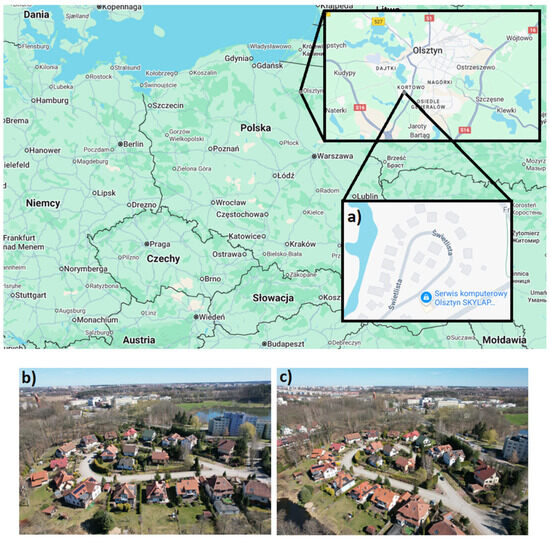 Research object localization, (a) maps from Google Maps (downloaded on 20 February 2025), (b,c) photos from UAV.