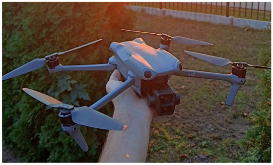 For the implementation of the project, we used the commercial unmanned aerial vehicle DJI Air 3 with the RC-N2 controller, equipped with a wide-angle camera and a medium telephoto lens. The UAV used for data collection is presented in Figure 3.