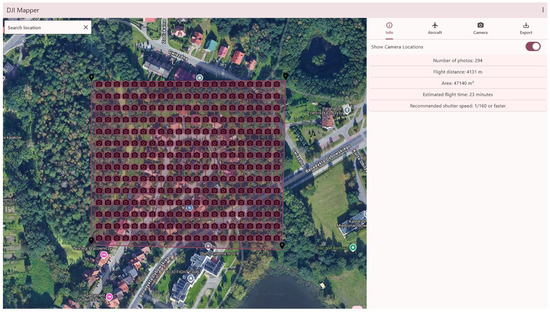 For UAV route planning, the free DJI Mapper v. 1.2 application from Yaros Mallorca’s GitHub (v1.2) repository was utilized. This tool enabled the definition of the flight area along with key parameters such as the number of images, total coverage area, and flight distance. The application facilitates photogrammetric operations for unmanned aerial vehicles (UAVs) with a locked Software Development Kit (SDK). It is specifically designed for UAV models operating under the DJI Fly ecosystem, including the DJI Mini 4 Pro, DJI Air 3, DJI Mavic 3, Mavic 3 Cine, and Mavic 3 Classic.