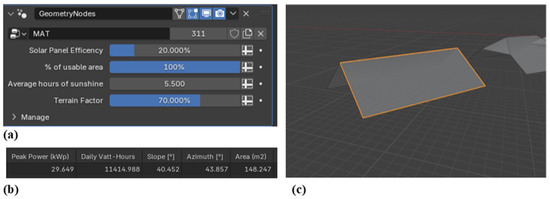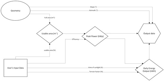 Based on the diagram, there are two types of input data. User input data that consists of values like: percentage of the roof’s total area that can be used for solar panels, efficiency of solar panels tested in study area, average daily hours of sunlight in study area and terrain factor. Values for each input data can be changed based on location and type of solar panels used on each roof. The other type of input data is based on the geometry of the roof that is calculated automatically for each roof individually inside the MAT by utilizing Blender’s Geometry nodes.