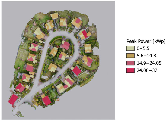 The spatial distribution of solar potential varies across the neighborhood, with certain rooftops demonstrating significantly higher peak power values.