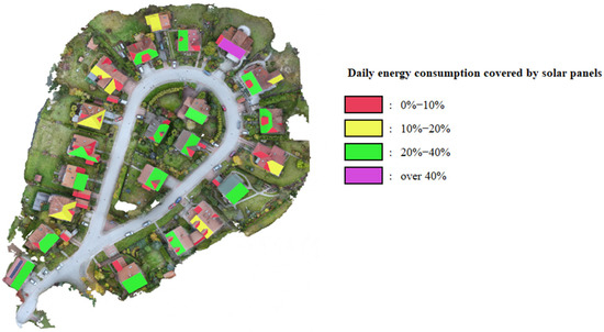 Figure 14 graphically illustrates the distribution of each type of roof segment. It also shows that every house has at least one roof segment capable of covering at least 10% of the daily energy consumption, making it suitable for potential solar panel installation.
