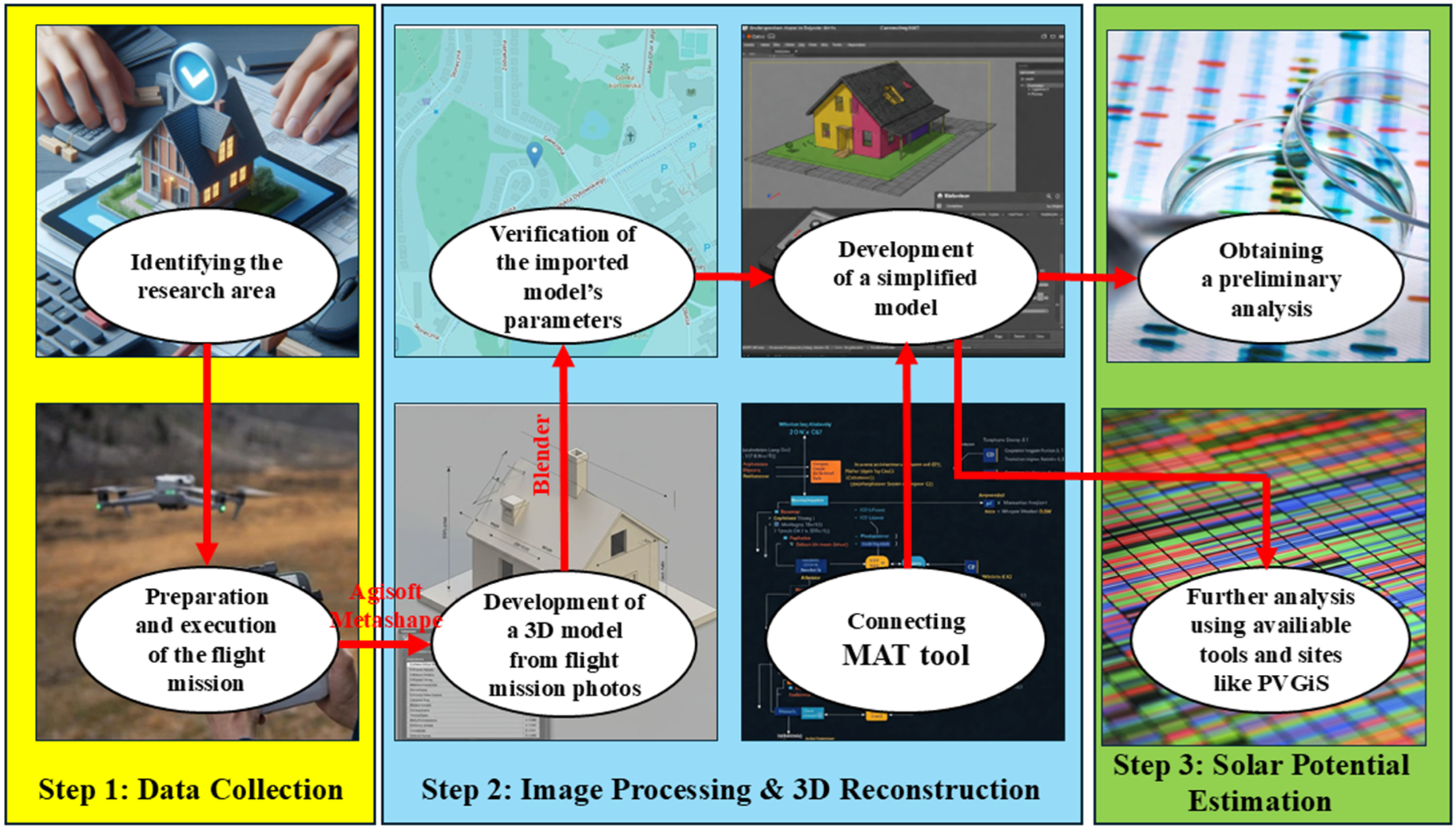 Solar potential estimation is a critical step in evaluating the feasibility and expected energy yield of rooftop PV installations. The proposed methodology integrates UAV-based 3D modeling with computational analysis to assess rooftop characteristics and estimate solar energy production.