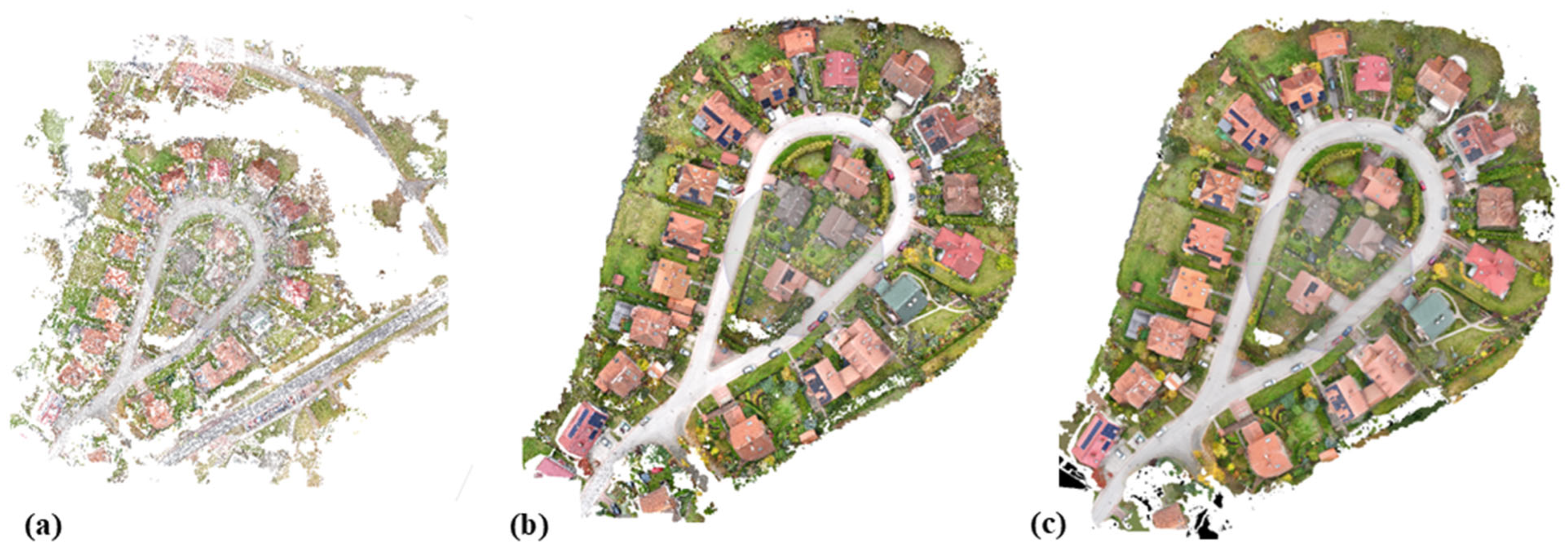 Post-processing was conducted using Agisoft Metashape Pro. After importing 300 images into the software, an initial alignment process was performed to establish georeferencing. Following alignment, a sparse point cloud was generated. Utilizing tools such as “Filter by Confidence,” points with low confidence levels were identified and removed to enhance data accuracy in subsequent processing stages.