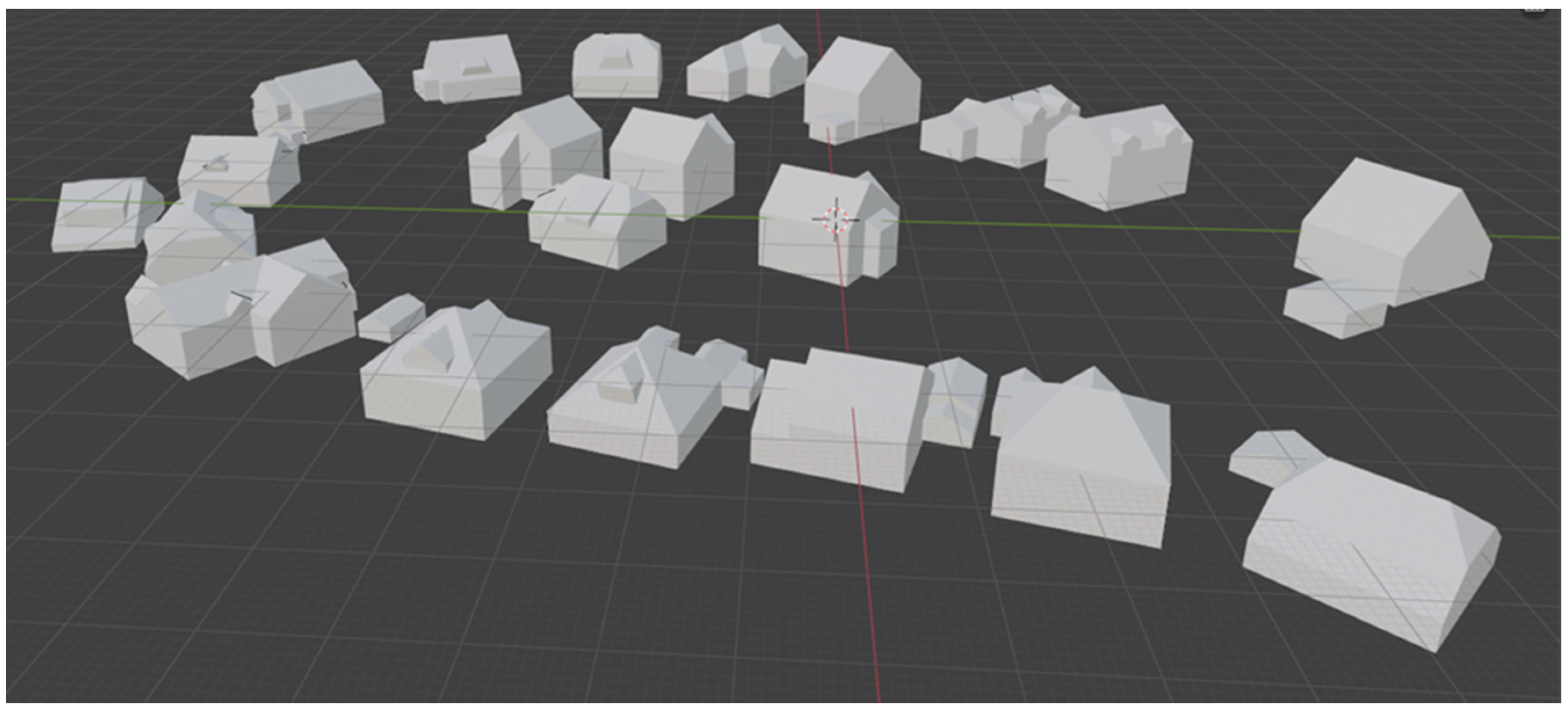 The next stage of processing is creating a simplified 3D models of buildings located in the study area while keeping the complexity of roofs. The generated 3D models of buildings are presented in