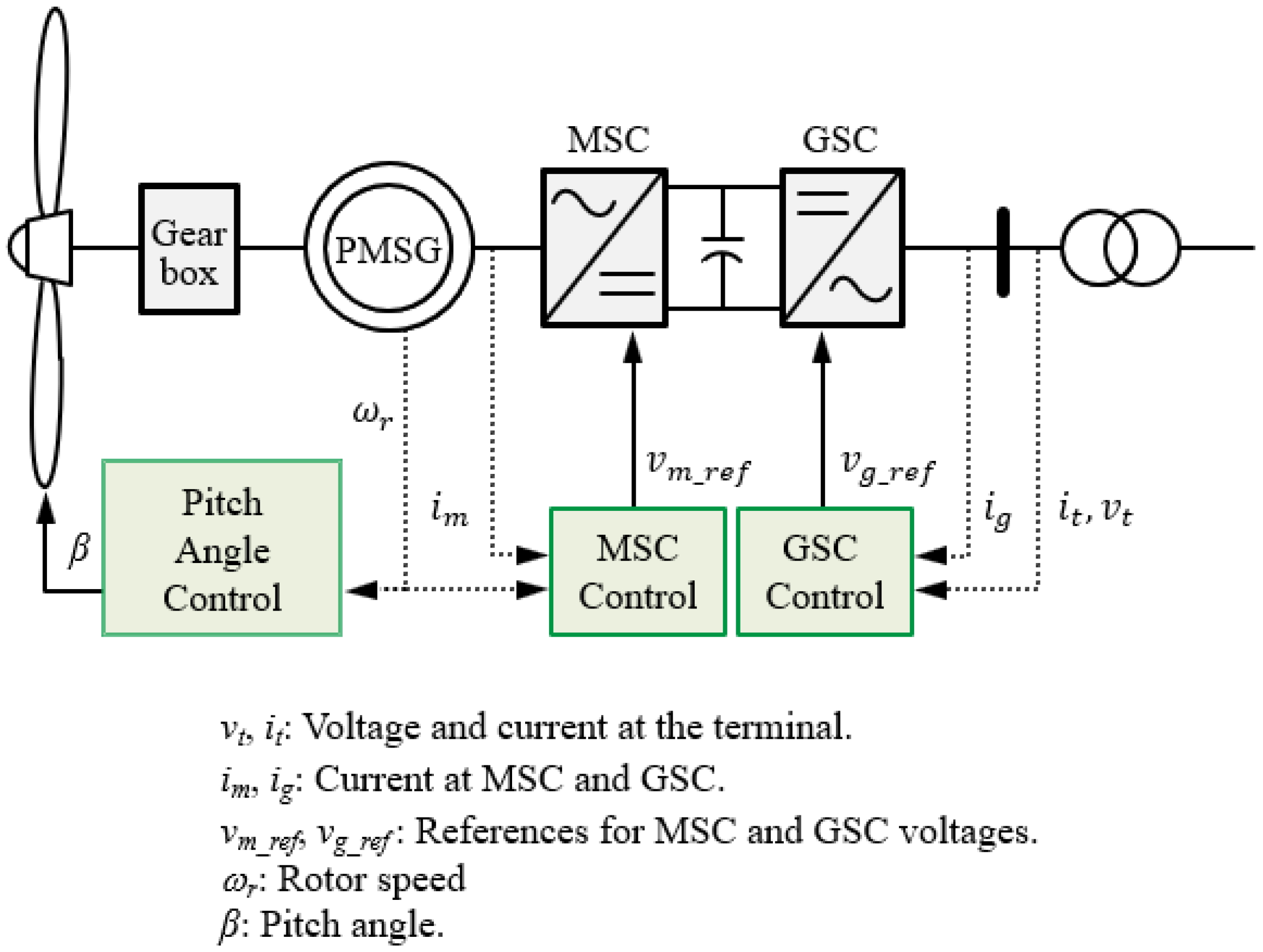 Figure 2, which includes controllers for the machine-side converter (MSC), the grid-side converter (GSC), and the pitch actuator. The MSC regulates the active power exchange between the generator and the grid, while the GSC is responsible for stabilizing the DC-link voltage and managing reactive power. The pitch-angle controller adjusts the blade pitch to ensure that the rotor speed (