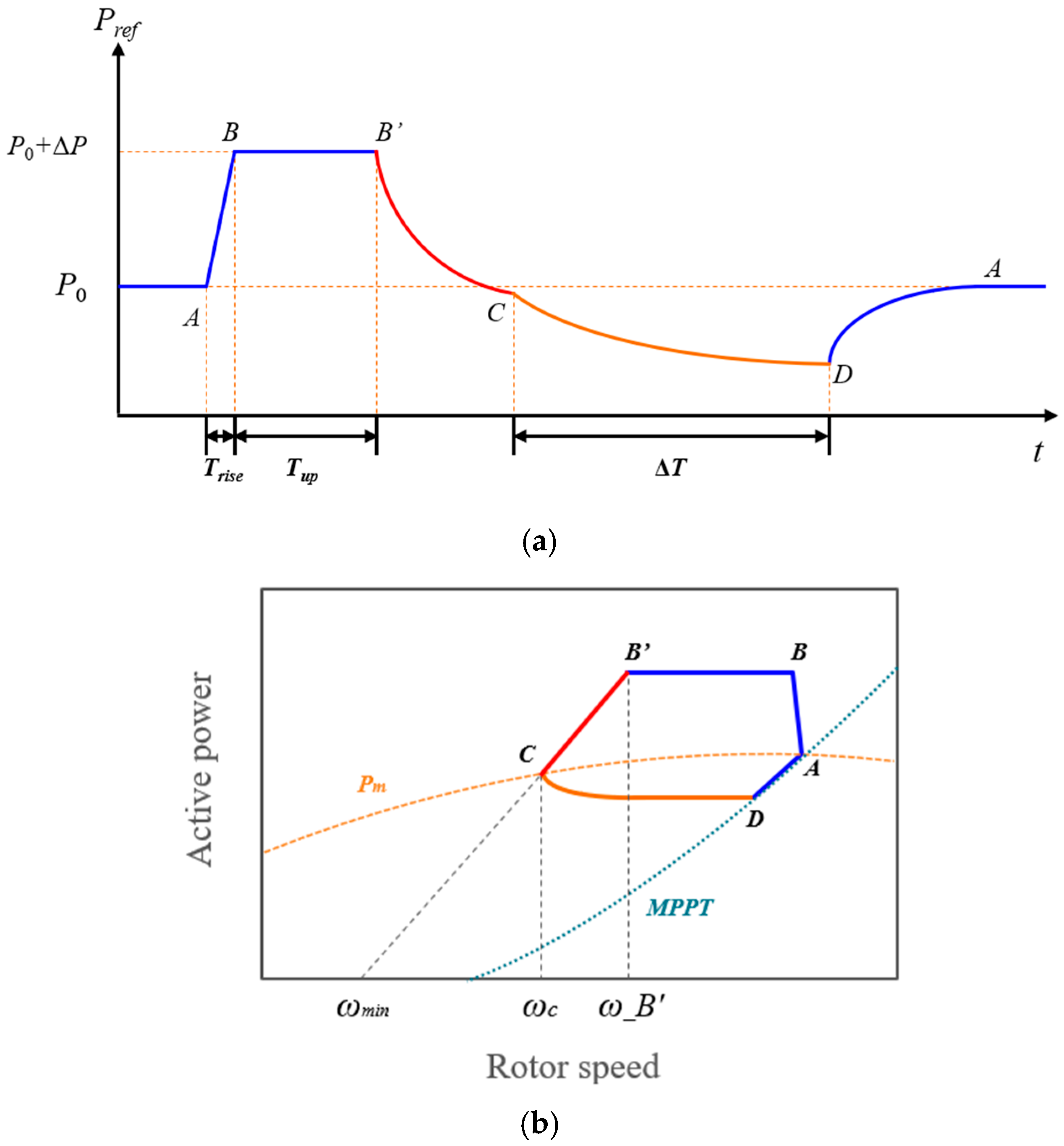 Once rotor speed stabilizes, the trajectory transitions smoothly from point C to D, enabling a gradual return to MPPT operation. The transition is expressed as