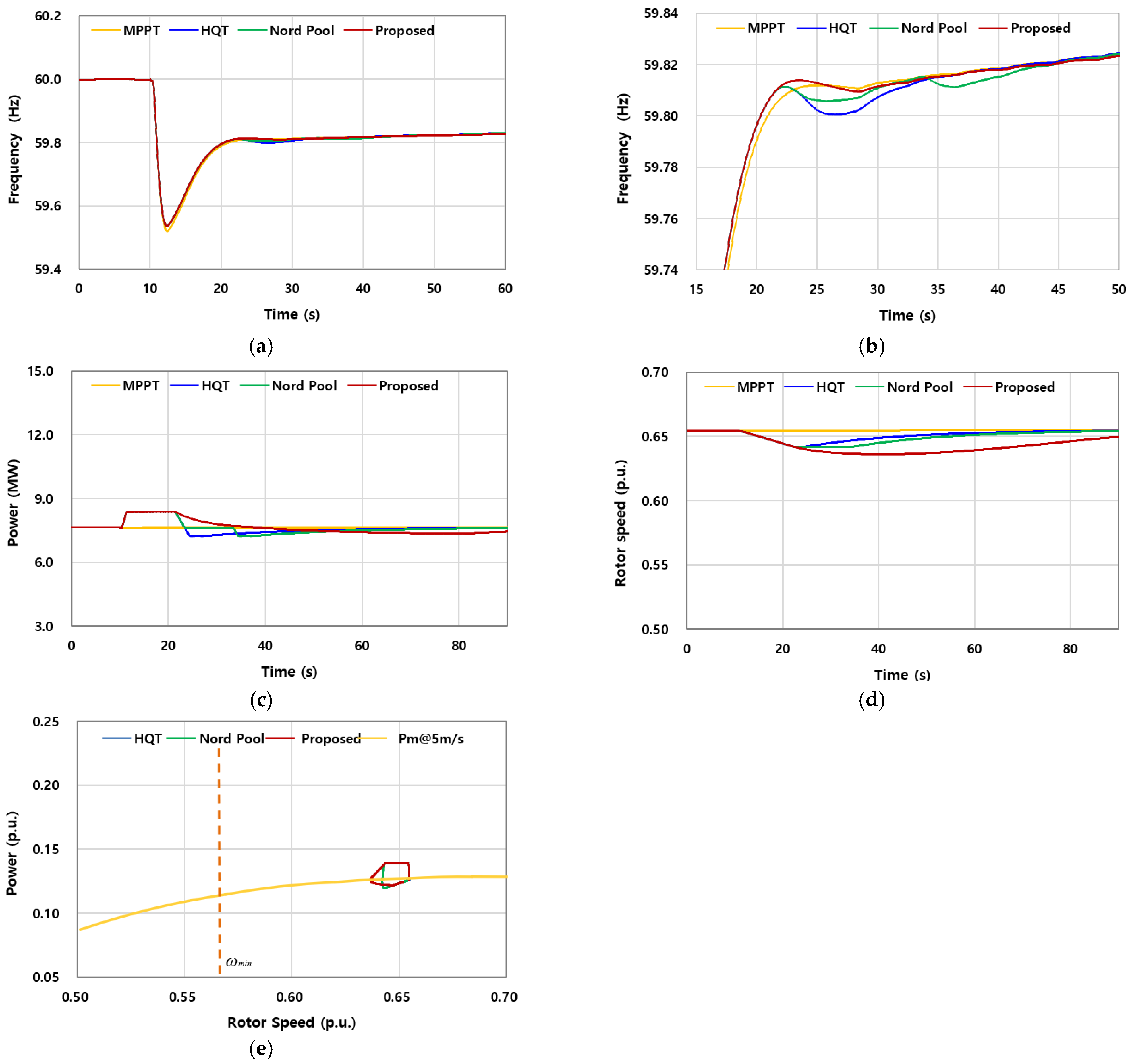 Figure 10b indicates that the proposed scheme achieved 59.812 Hz, outperforming both HQT (59.777 Hz) and Nord Pool (59.790 Hz). This improvement is attributable to the rotor-speed-dependent recovery, which alleviates over-deceleration and mitigates the SFD, even under low boost conditions.