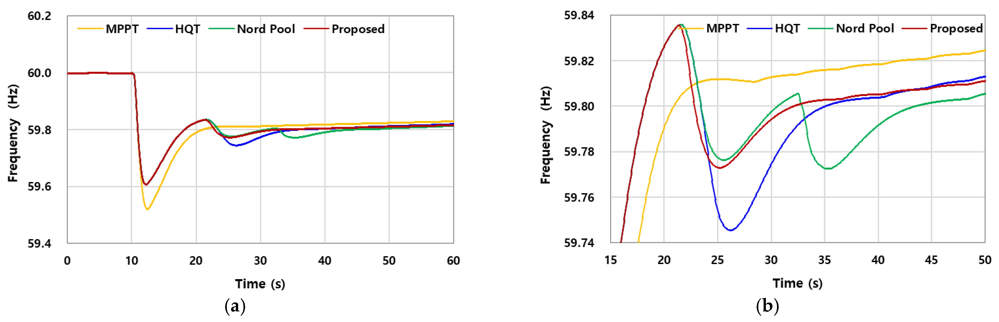 = 10% of the pre-event output. Similar to Case 1, all three SI schemes (HQT, Nord Pool, and the proposed method) achieved the same improvement in the first frequency nadir relative to MPPT, raising it from 59.507 Hz to 59.552 Hz (