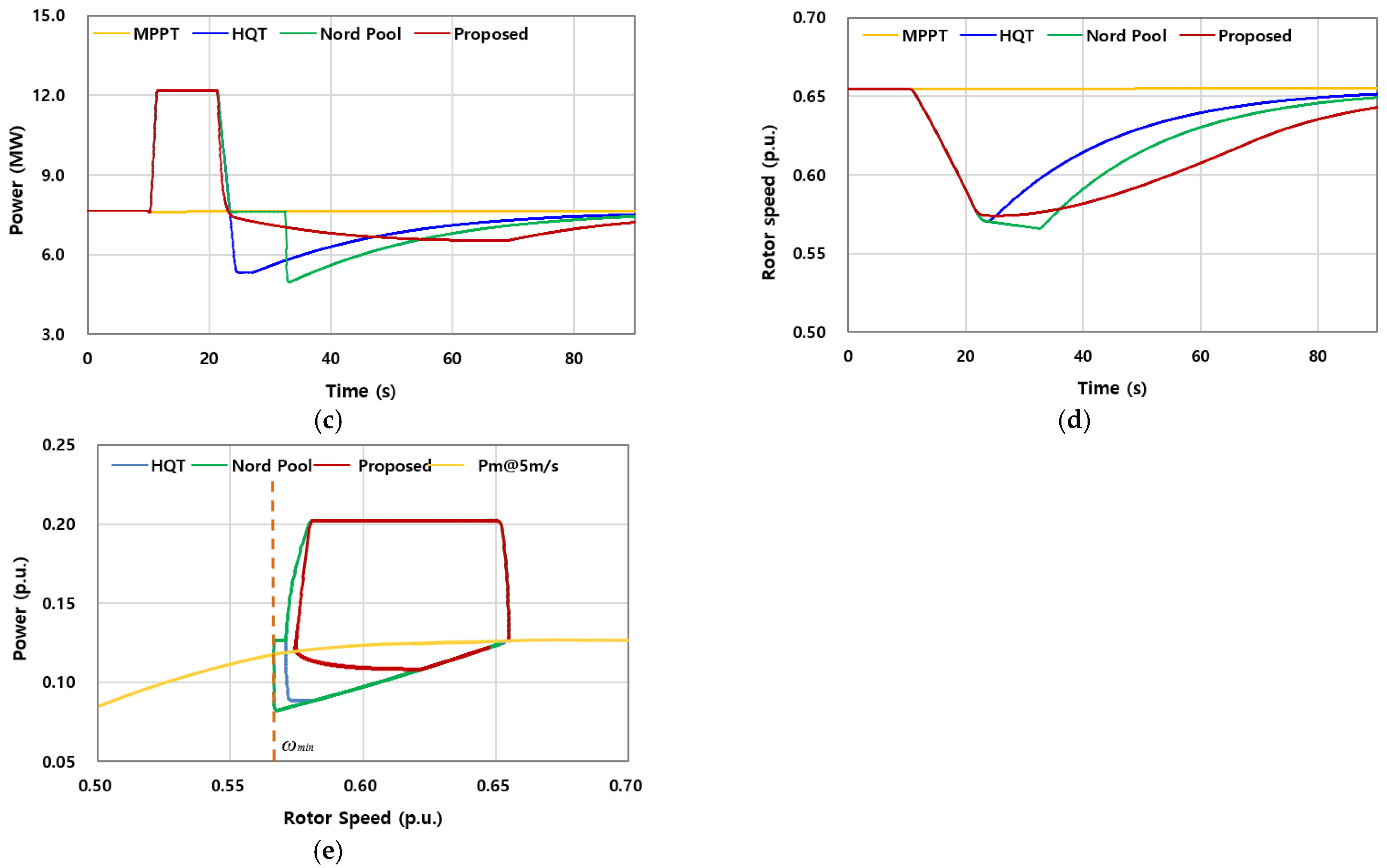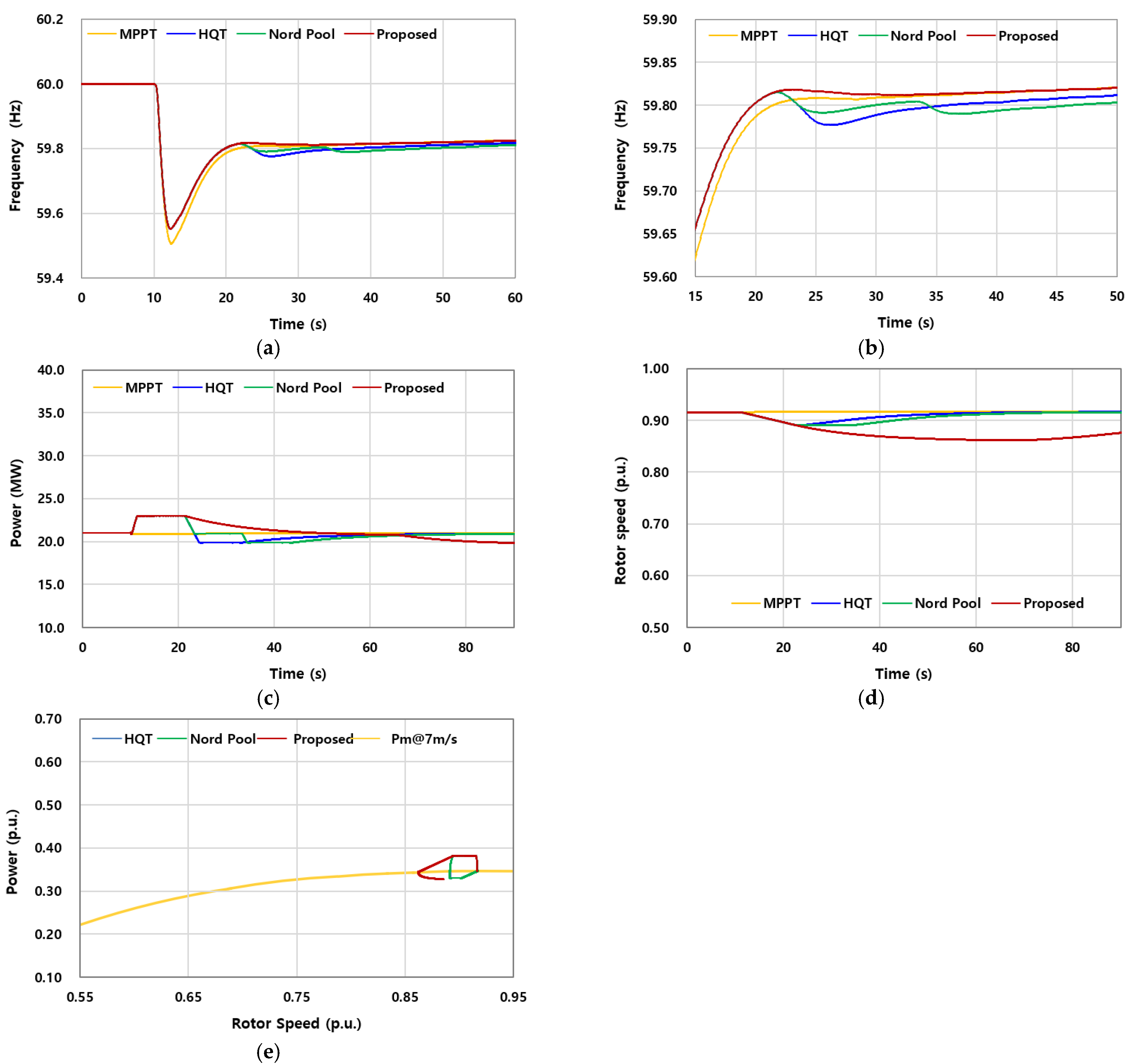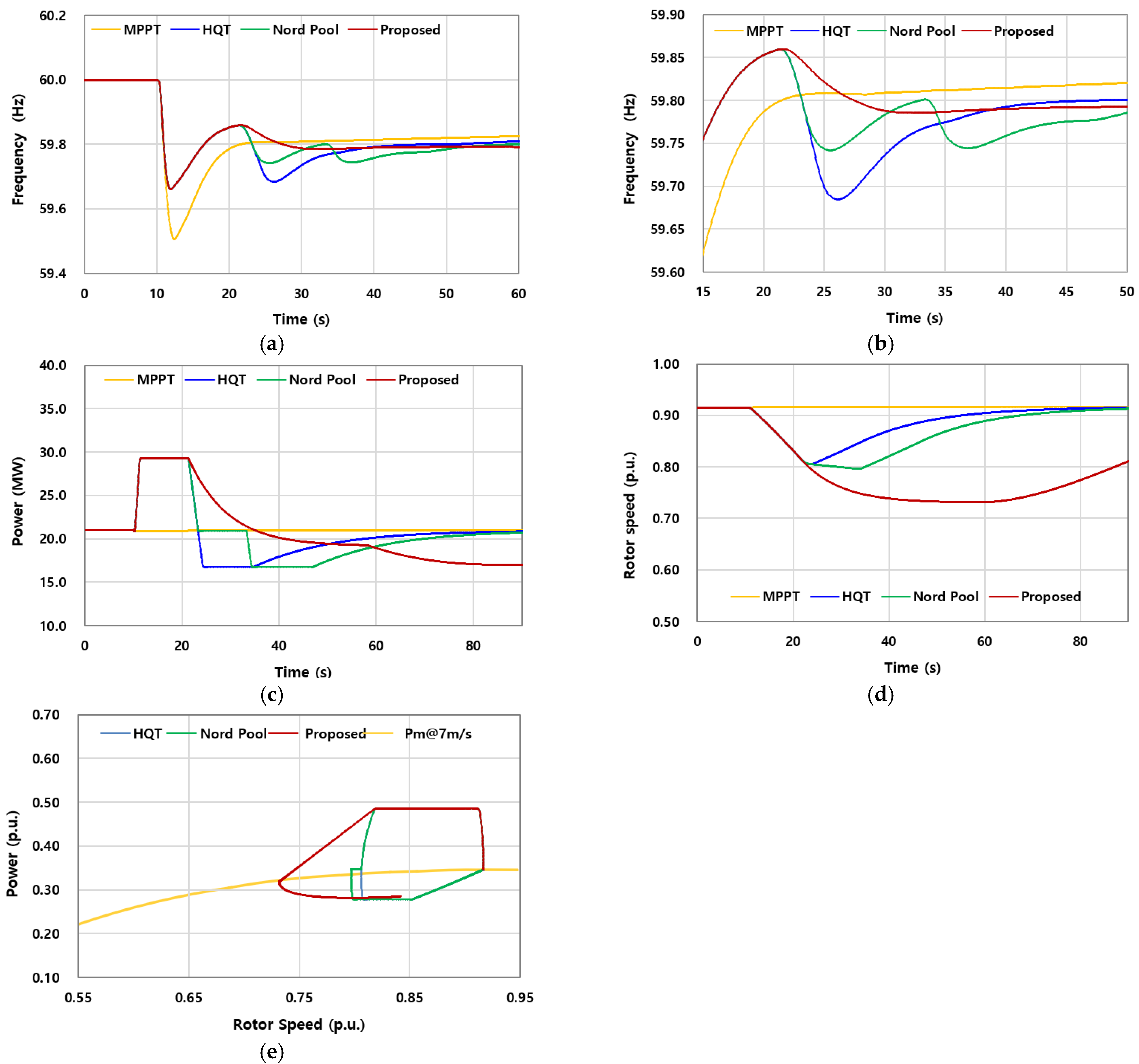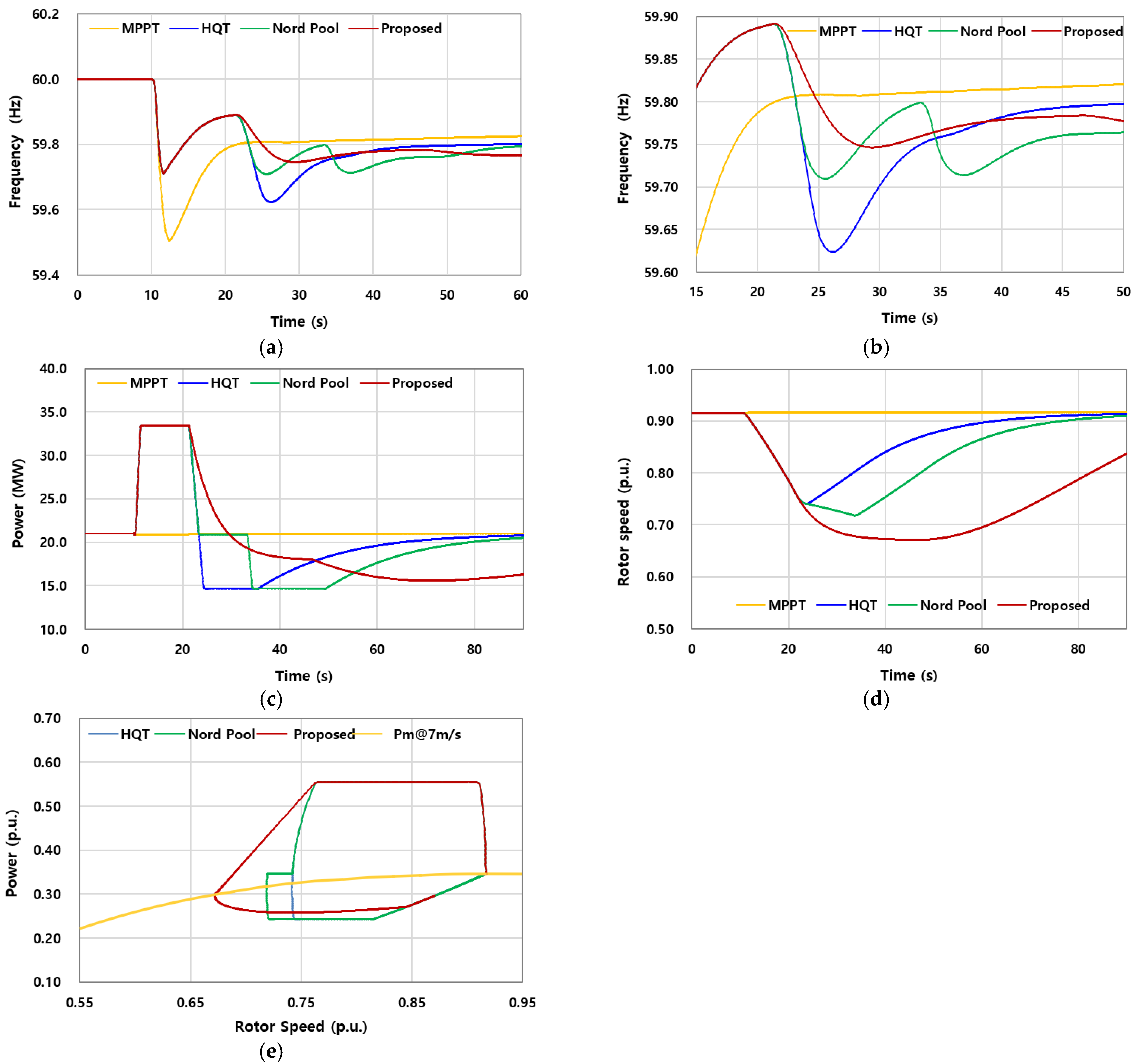 Figure 10d, the rotor maintained a significantly higher pre-event speed (0.891 p.u.), ensuring a substantial energy reserve. However, since the boost level was kept at only 10%, the actual extracted energy remained small: approximately 9% for HQT and Nord Pool, and 19% for the proposed scheme (