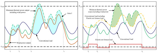 During peak consumption (e.g., daytime), wind speed is often low or unstable, while at night or in the windy season, it is stronger, but load levels are low, creating wind power’s reverse regulation characteristic. As shown in t1~t2 and t3~t4 of Figure 2, low-load periods have the lowest wind accommodation and are prime times for curtailment. When large-scale wind power exceeds thermal plants’ regulation range, fully absorbing it increases thermal units’ deep peak regulation pressure, risking shutdowns. To ensure system safety and economy, grids cannot always absorb all wind power, causing curtailment, especially during low-load and high thermal output. By comparison, when the sum of minimum thermal power and wind power exceeds load consumption, the high-energy-consuming electric-fused magnesium furnace load’s participation in regulation reduces the power system’s wind curtailment area from the left light blue region to the right light green region, as Equation (4) shows: