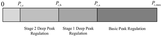 Figure 3 presents the schematic diagram for the deep peak regulation of thermal power units, where Pi,max denotes the maximum technical output, Pi,a represents the minimum technical output for conventional operation, and Pi,b and Pi,c correspond to the minimum outputs for the first and second stages of deep peak regulation, respectively.