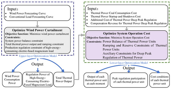 Two-layer optimization is a nested optimization that involves two layers of optimization tasks with a hierarchical relationship, where the lower-layer optimization optimizes its own objective function based on the solution provided by the upper-layer decision-making. This paper establishes a two-layer optimization model to describe the source–load coordination optimization problem of high-energy-consuming electric-fused magnesium loads participating in wind power consumption. The proposed hierarchical relationship model between the upper and lower layers is shown in Figure 4.