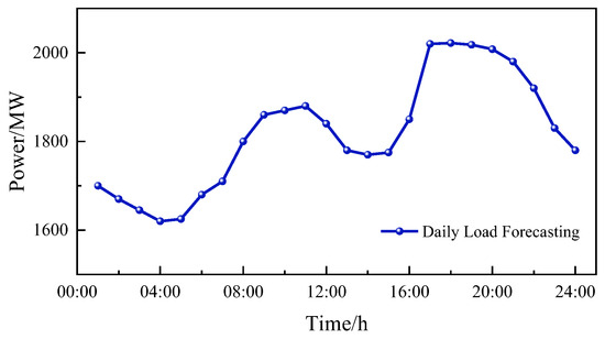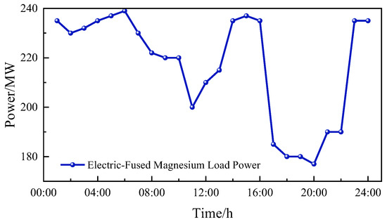 In Equation (5), T is the number of time periods in the day-ahead scheduling cycle, and its value is taken as 24; PtW is the total active power output of all wind power plants in time period t; PtG is the total active power output of all thermal power plants in time period t; PtL is the active power of the system’s conventional load in time period t; NMg is the number of electric-fused magnesium furnaces.