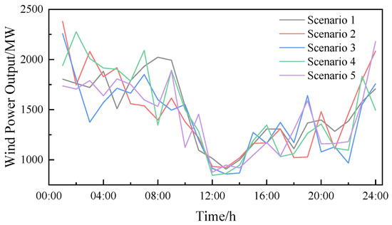 The scenario reduction method based on the Kantorovich distance was employed to eliminate scenarios with high redundancy and low probability, ultimately yielding five typical scenarios, as illustrated in Figure 7. Since the five generated typical scenarios exhibit broadly similar characteristics, this chapter selects the first typical scenario, which demonstrates the highest occurrence probability, to analyze wind power integration.