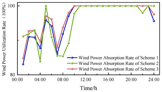 Figure 8 shows the absorption situation of the system’s wind power under different schemes. Wind curtailment mainly occurs during the 1–10 time periods across all three schemes. By comparing Scheme 1 and Scheme 2, it is evident that after incorporating wind power uncertainty, the wind power accommodation rate during the 1–10 time periods decreases significantly. Additionally, wind curtailment also emerges in the 22nd time period. When comparing Scheme 2 and Scheme 3, it is obvious that after considering the regulation of high-energy-consuming electric-fused magnesium loads, the wind curtailment volume during the 1–10 time periods is drastically reduced.