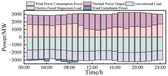 (2) The study investigates the impact of wind power uncertainty, adopts the scenario method to simulate wind power uncertainty, and uses CPLEX for solution in combination with the case study. Simulation results show that wind power uncertainty exerts a significant impact on the system: it substantially increases the system’s economic costs and wind curtailment volume, which is detrimental to the stable operation of thermal power units. However, after considering the high-energy-consuming electric-fused magnesium loads, the negative impacts caused by wind power uncertainty can be effectively mitigated, thereby enhancing the system’s wind power absorption capacity and reducing system operation costs.