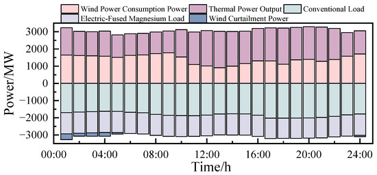 Figure 9, Figure 10 and Figure 11 respectively show the overall output of the system and the situation of wind curtailment for Schemes 1, 2, and 3. It can be observed that during the period from 00:00 to 09:00, thermal power units maintained a low output level to accommodate wind power and participated in deep peak regulation on multiple occasions. When comparing Scheme 1 and Scheme 2, after considering wind power uncertainty, thermal power units reduced their power output more frequently. This is not conducive to the stable operation of thermal power units and also has a negative impact on economic efficiency. By comparing Scheme 1 and Scheme 3, it can be seen that even when the impact of wind power uncertainty is taken into account, the output characteristics of thermal power units can still maintain a good state after the introduction of electric-fused magnesium loads. Furthermore, the wind curtailment situation has also been improved, which is intuitively reflected in the complete accommodation of wind power during the period from 06:00 to 09:00.