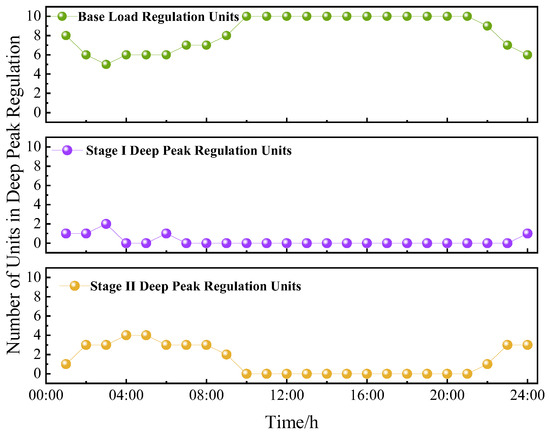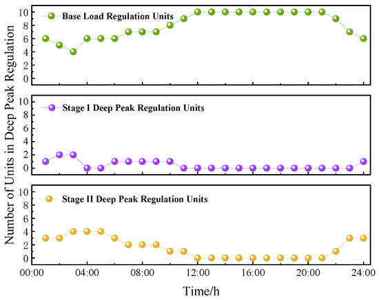 Figure 13 and Figure 14 show the situations of thermal power units participating in deep peak regulation in each time period under Scheme 1 and Scheme 3. Through comparative analysis, at 01:00, in Scheme 1, four thermal power units are dispatched to participate in deep peak regulation, among which one unit participates in the deep peak regulation of the first stage and three units participate in the deep peak regulation of the second stage. While in Scheme 2, it is optimized to have two thermal power units participating in deep peak regulation, and the numbers of thermal power units participating in the first and second deep peak regulations are one unit and one unit, respectively. At the moments of 02:00, 03:00, 09:00, 10:00, and 11:00, Scheme 3 correspondingly reduces the number of thermal power units participating in deep peak regulation. Due to the participation of the high-energy-consuming electric-fused magnesium load in Scheme 3, the deep peak regulation structure of the thermal power units is further optimized, enabling more efficient and economical allocation and utilization of the deep peak regulation resources of the thermal power units.