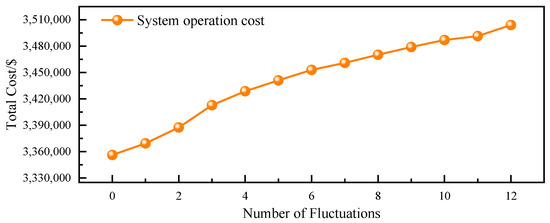 We analyzed the impact of model outputs with respect to the frequency of wind power fluctuation periods. In this sensitivity analysis, the maximum duration of wind power fluctuation periods was set to 12 h. The sensitivity analysis results are shown in Figure 15. As seen in Figure 15, there is a strong correlation between the total cost and the frequency of wind power output fluctuations, indicating that the number of wind power output fluctuations affects the total cost. When wind power output fluctuates significantly, frequent grid adjustments are required to maintain a stable power supply, which may involve activating more reserve generation units or adopting other methods to stabilize the power supply. These additional costs are incorporated into the total cost, leading to an increase in the overall cost.