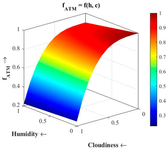 Atmospheric conditions including humidity, cloudiness and solar panel altitude above sea level are approximately taken into account as follows [44,45]: