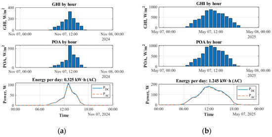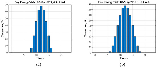 Result of the calculation of the solar panel’s hourly electricity production over a day: (a) 7 November 2024; (b) 7 May 2025.