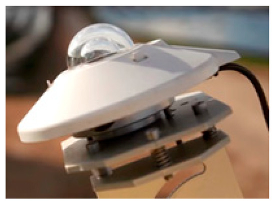 Below are the results of experimental studies of solar radiation carried out using the meteorological station instruments at the solar power plant in Saran, Kazakhstan [46]. The solar power plant occupies an area of 160 ha in the northeastern part of the city of Saran, at geographic coordinates (49.8138, 72.8256). The site elevation is 491 m above sea level, and the official time zone is UTC+5. The panel tilt angle is 30°. Measurements were performed with a Kipp & Zonen SMP10-V spectrally flat Class A pyranometer (Figure 3), configured for GHI (Global Horizontal Irradiance). The data logging interval is 1 hour.
