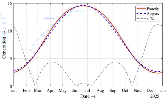 Let us present the results of calculations of hourly power generation by a solar panel throughout the day, under the following conditions: area of the panel—1 m2; humidity ; cloudiness ; panel tilt angle 30°; panel efficiency 18%. The results of the performed calculations are illustrated in Figure 2, which shows the hourly distribution of solar panel electricity production for two representative days of the year.